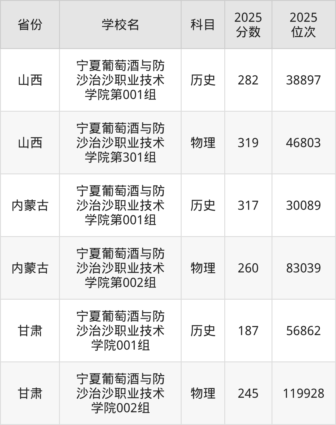 下面是宁夏葡萄酒与防沙治沙职业技术学院2025年录取分数线各省汇总,一起来了解下吧。