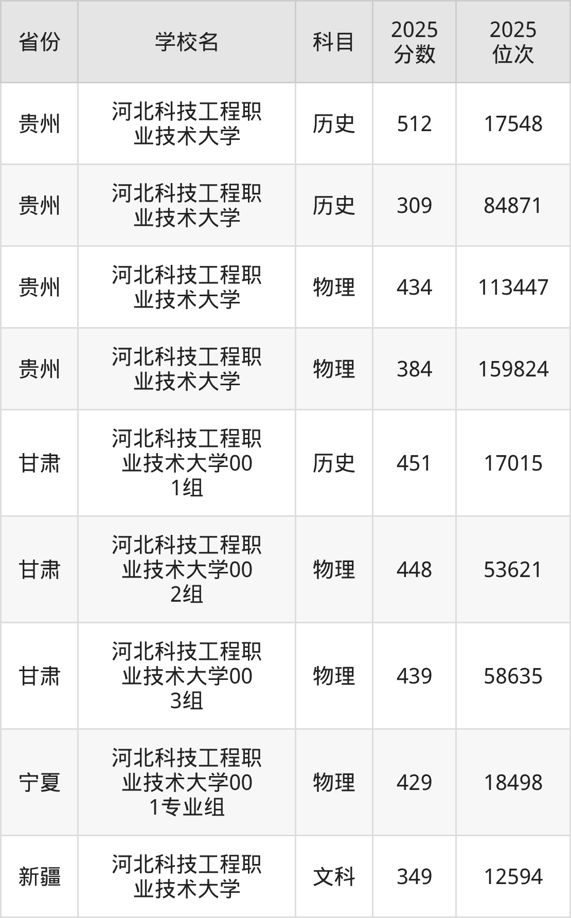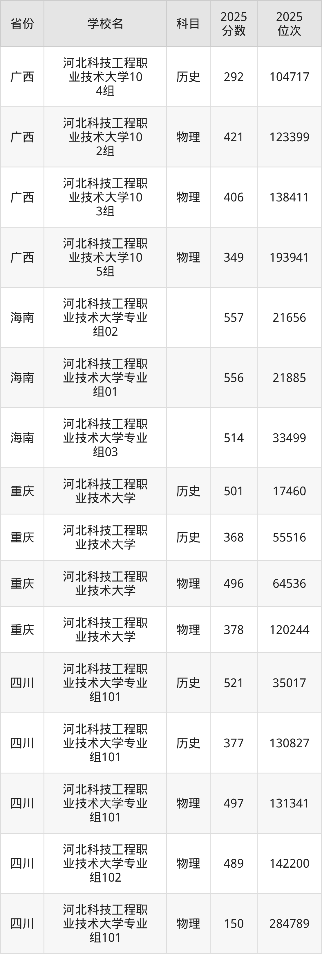 2025年河北科技工程职业技术大学历史类最低分430分(97977名)、物理类最低分404分(288231名)。