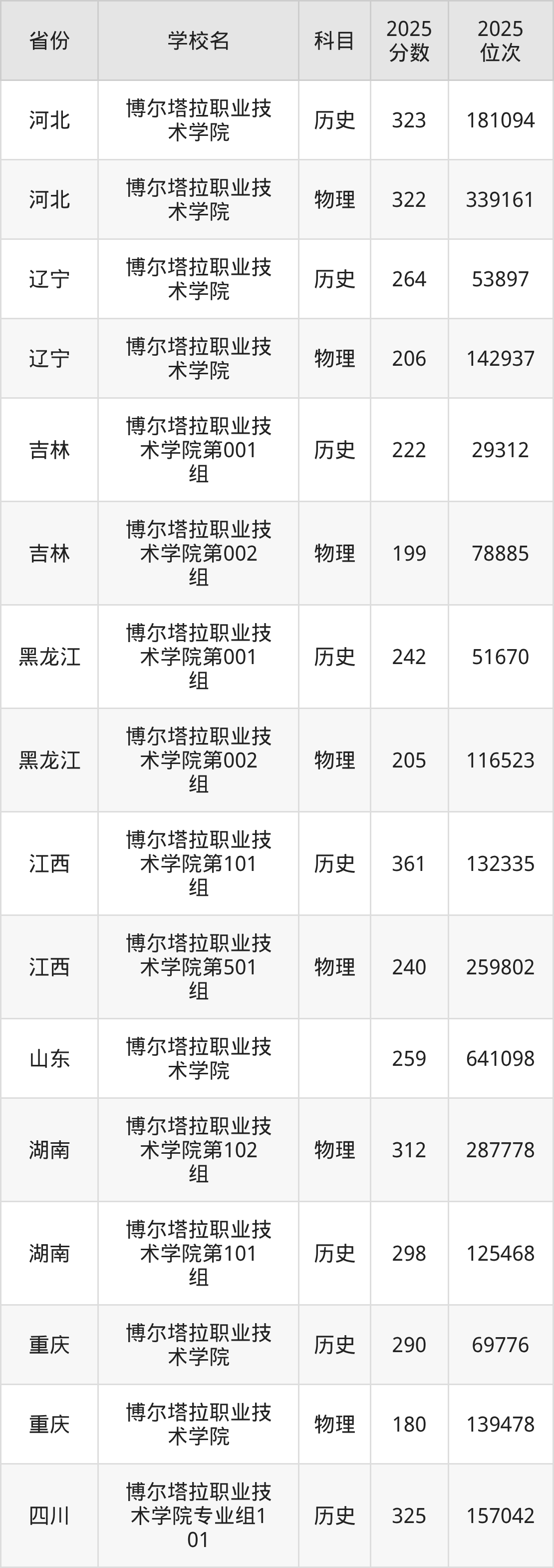 2025年博尔塔拉职业技术学院在维吾尔自治区内分文理科录取,其中文科最低分是220分、对应位次是22330名;理科最低分是201分,对应位次是51833名。