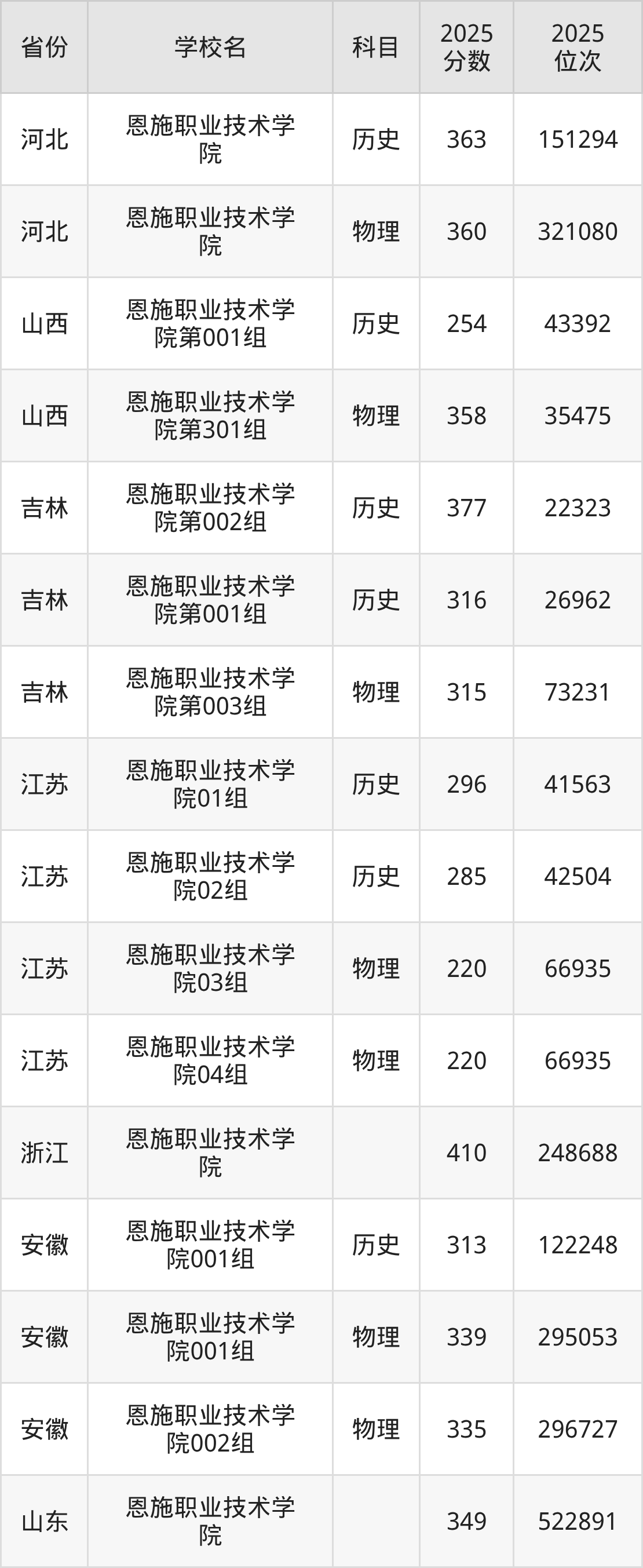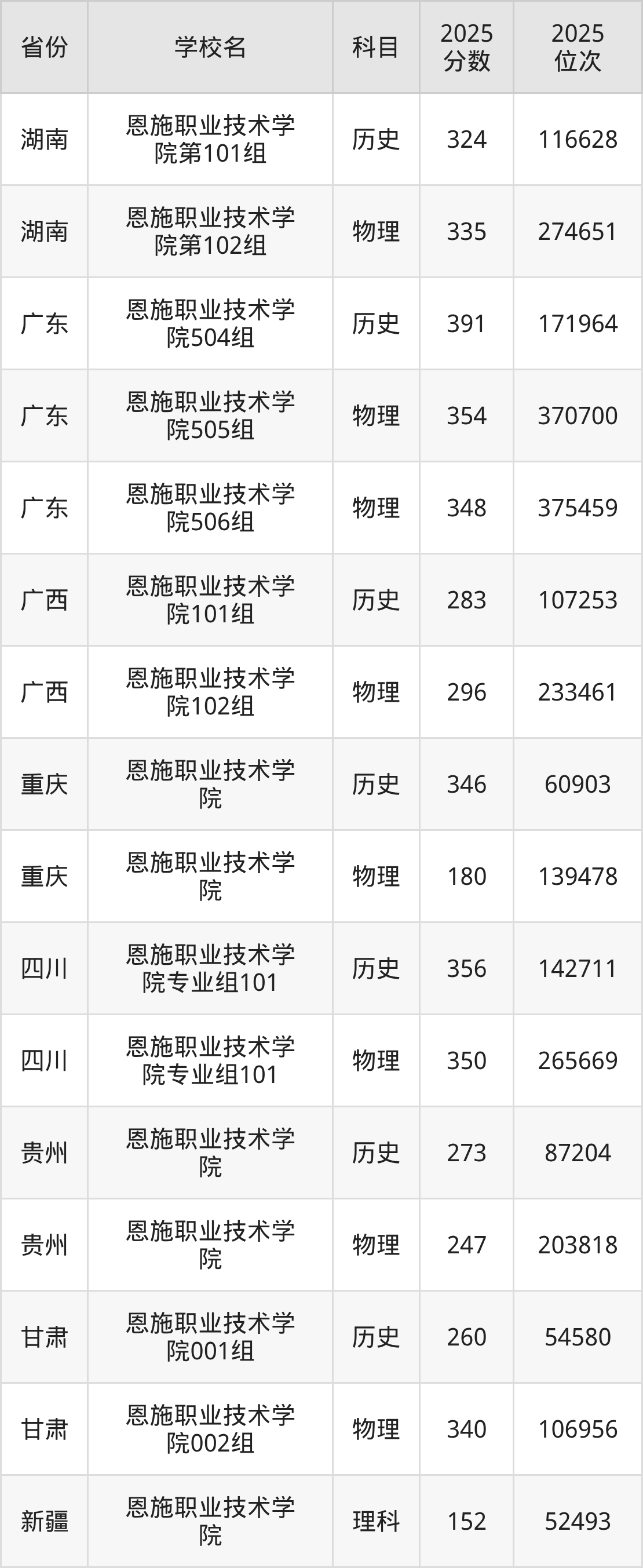 2025年恩施职业技术学院历史类最低分342分(98277名)、物理类最低分341分(201542名)。