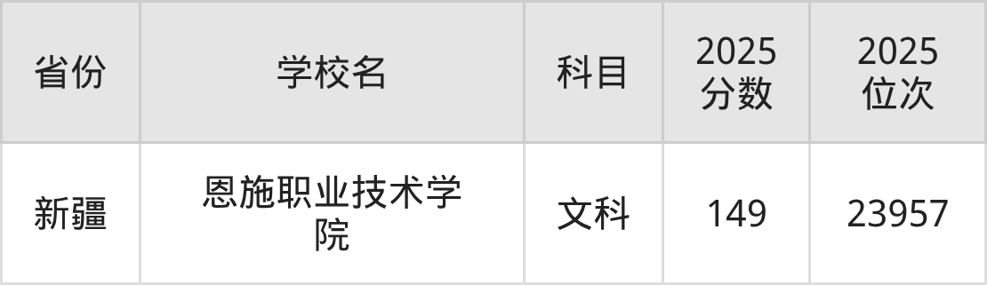2025年恩施职业技术学院在省外录取分数线范围整体位于149分到410分之间,录取分数线最低在新疆文科、录取分数线最高在浙江。