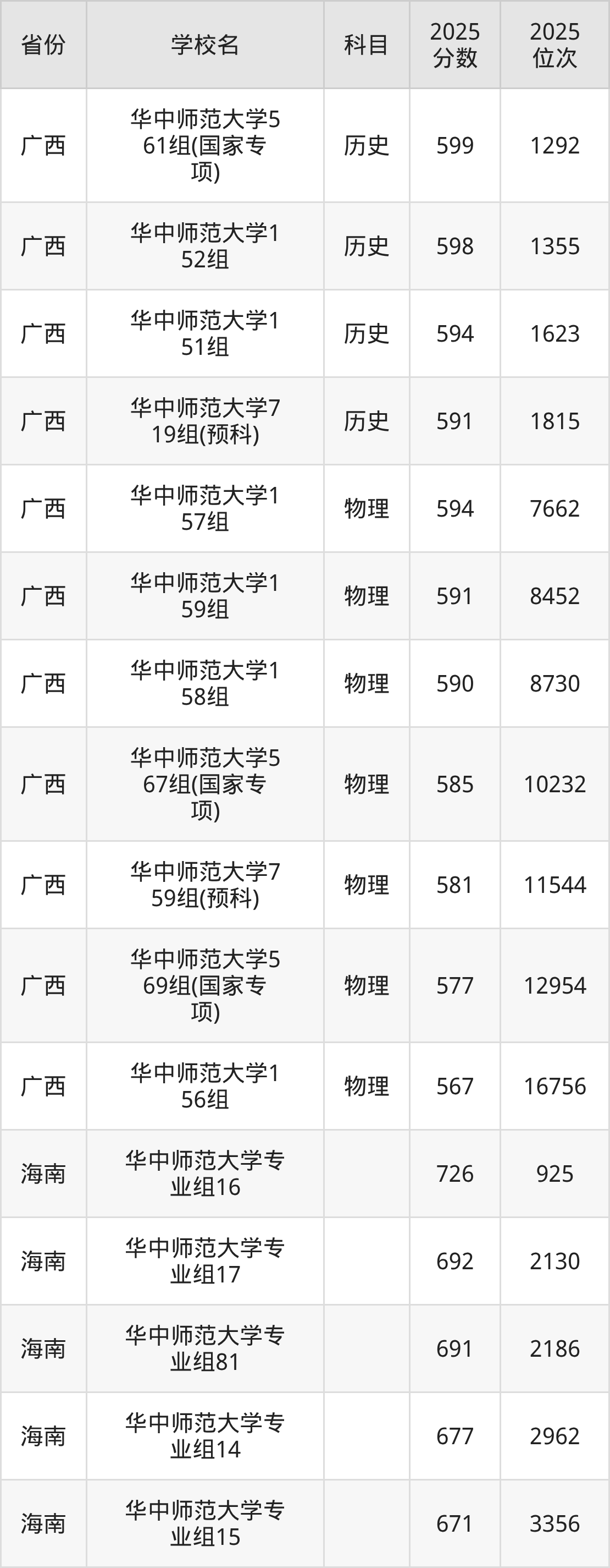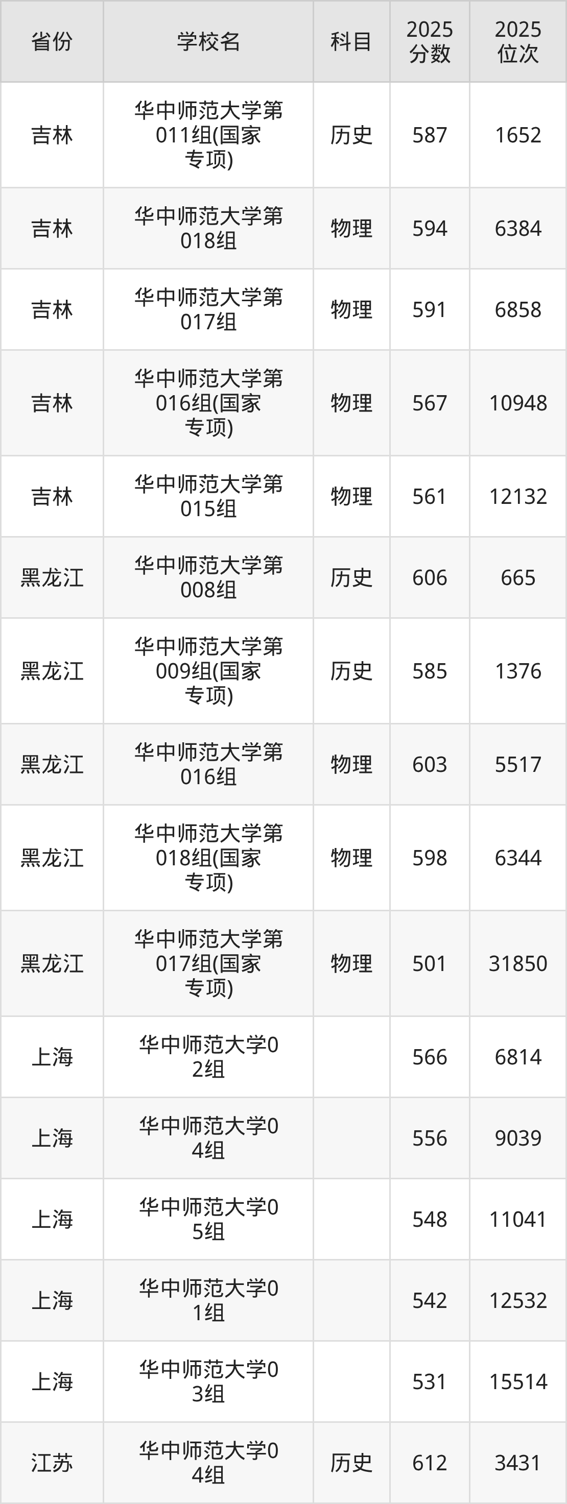 | 华中师范大学第 16组(国家专 项) | 历史 | 600 | 3166 |