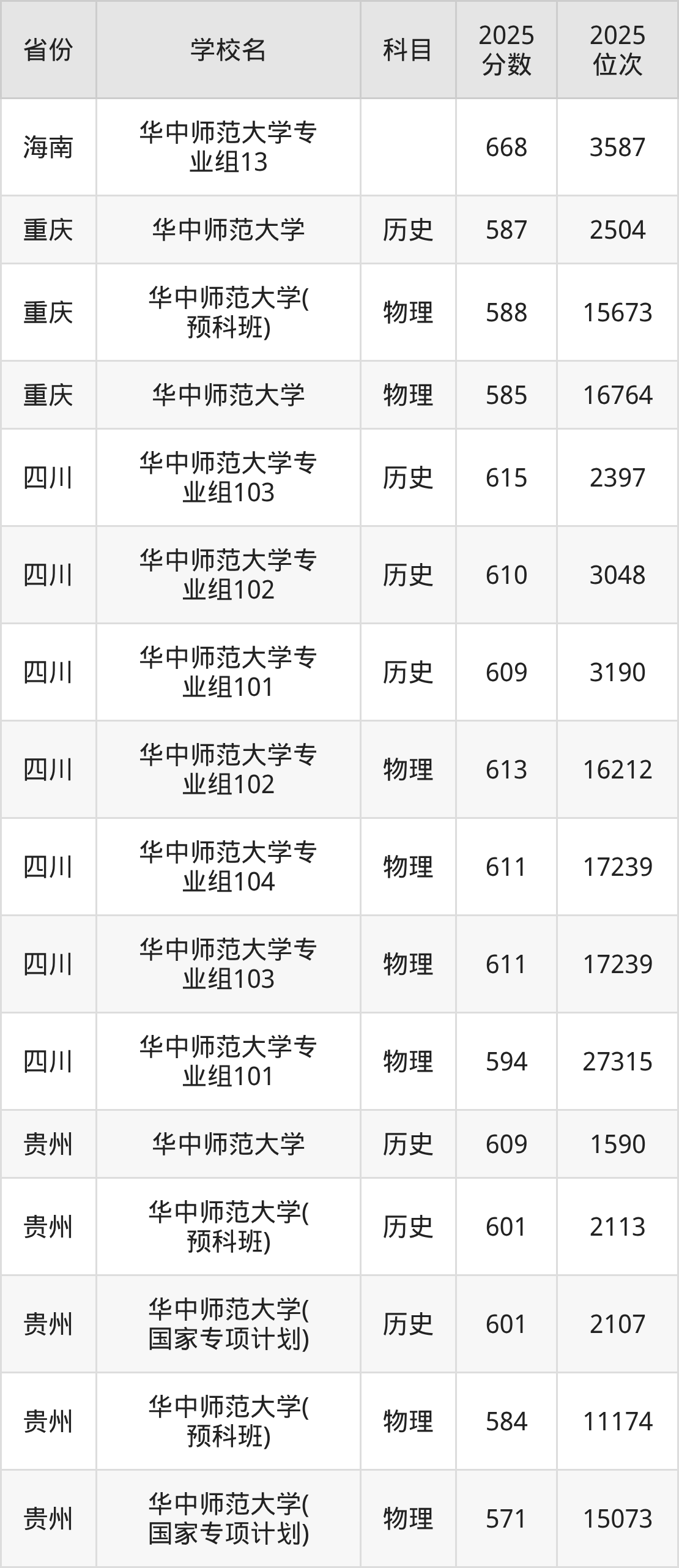 2025年华中师范大学历史类最低分598分(3467名)、物理类最低分584分(22070名)。