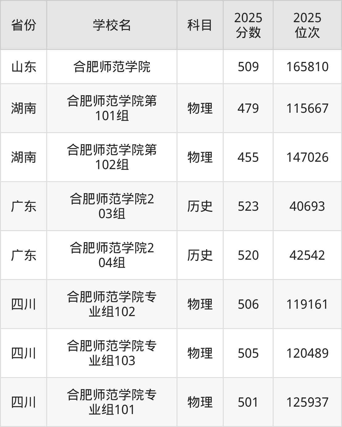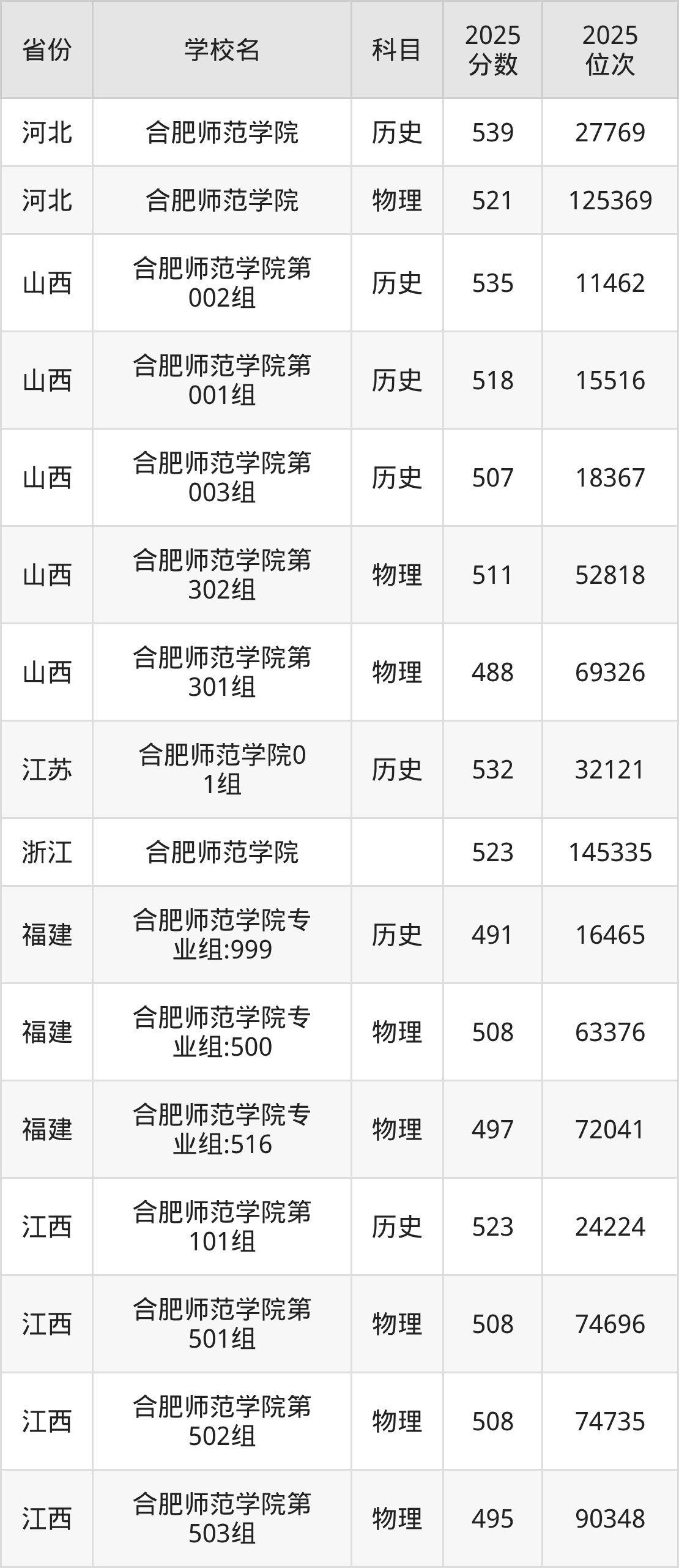 | 合肥师范学院0 05组 | 物理 | 513 | 116010 |