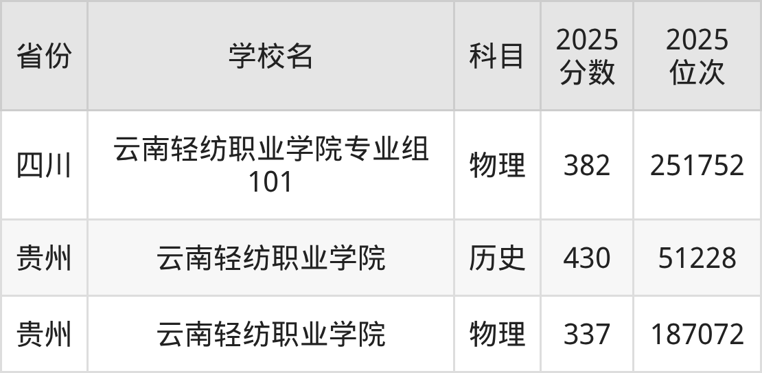 下面是云南轻纺职业学院2025年录取分数线各省汇总,一起来了解下吧。