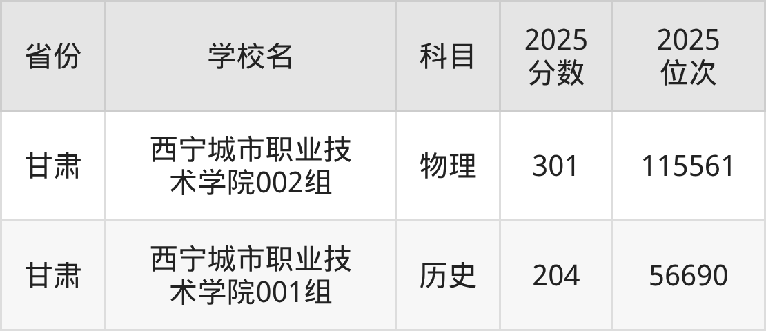 2025年西宁城市职业技术学院历史类最低分204分(56690名)、物理类最低分301分(115561名)。