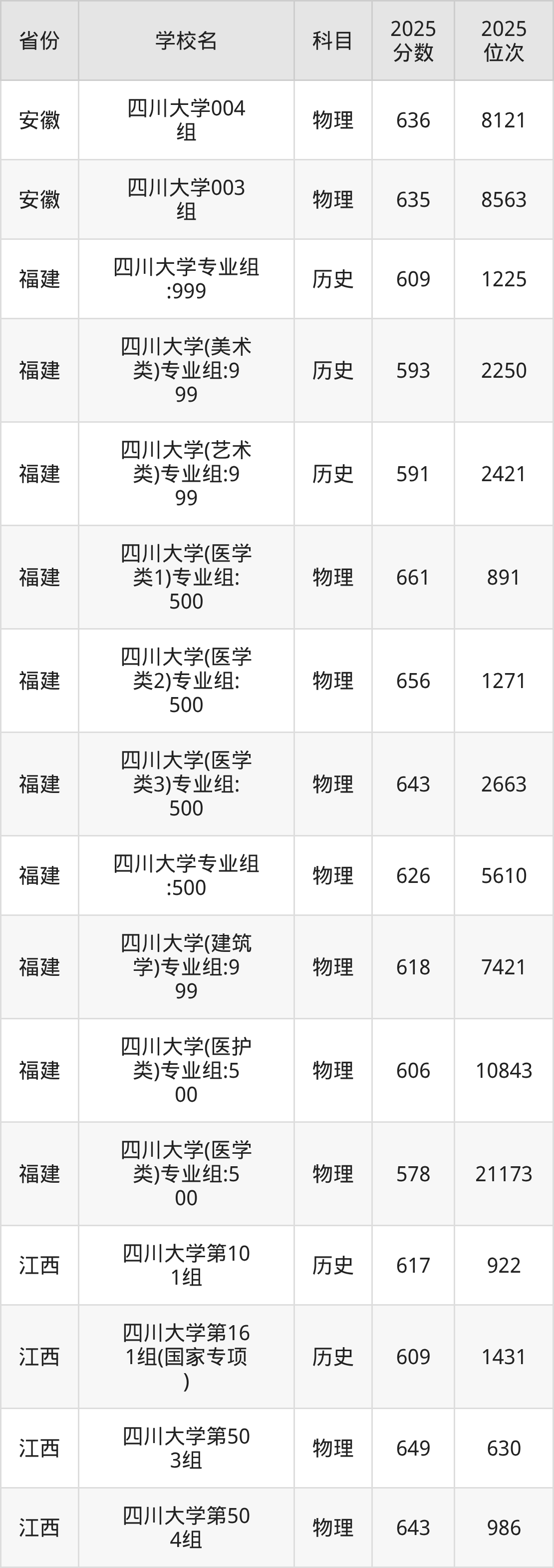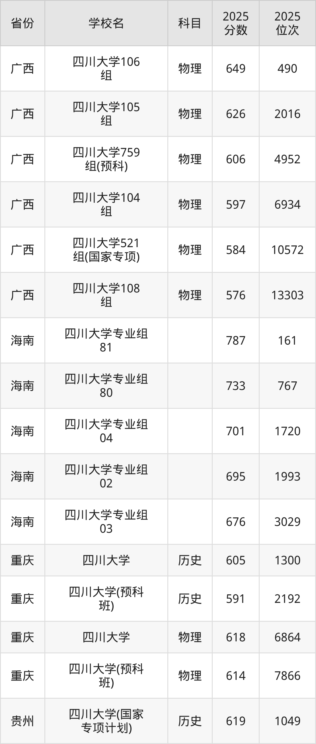 2025年四川大学在省内分历史物理科目类录取,其中历史类最低分是599分、对应位次是4765名;物理类最低分是601分,对应位次是22824名。
