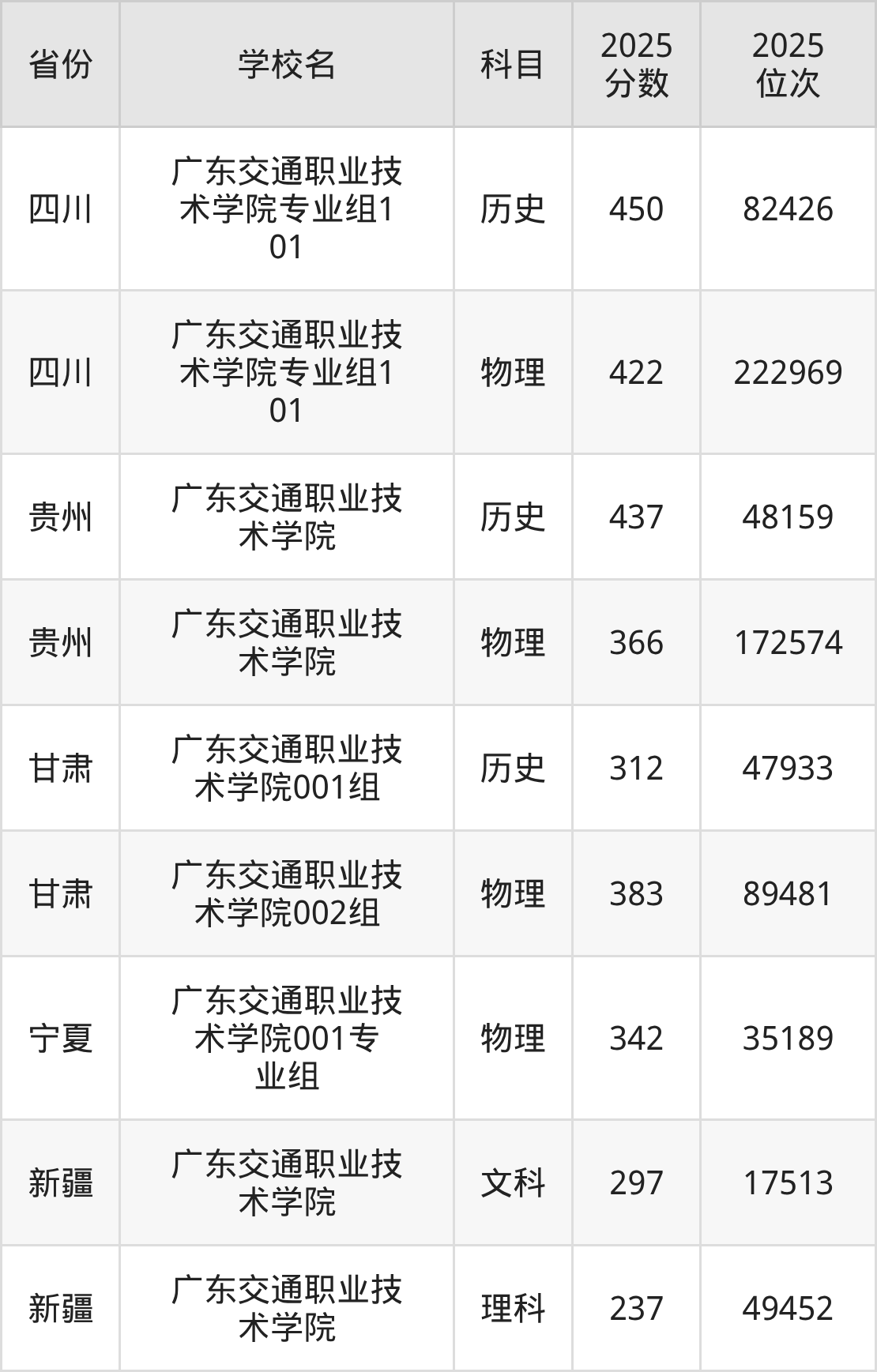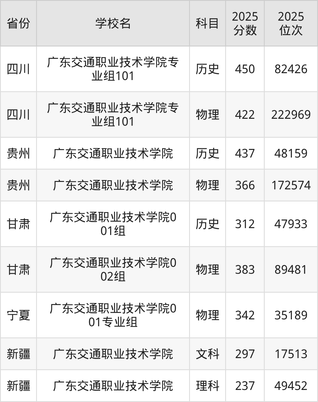 2025年广东交通职业技术学院在省外录取分数线范围整体位于237分到478分之间,录取分数线最低在新疆理科、录取分数线最高在江西历史(第101组)。