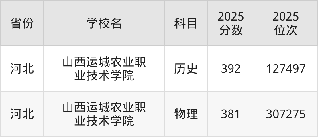 2025年山西运城农业职业技术学院在省内分历史物理科目类录取,其中历史类最低分是236分、对应位次是45847名;物理类最低分是111分,对应位次是62318名。