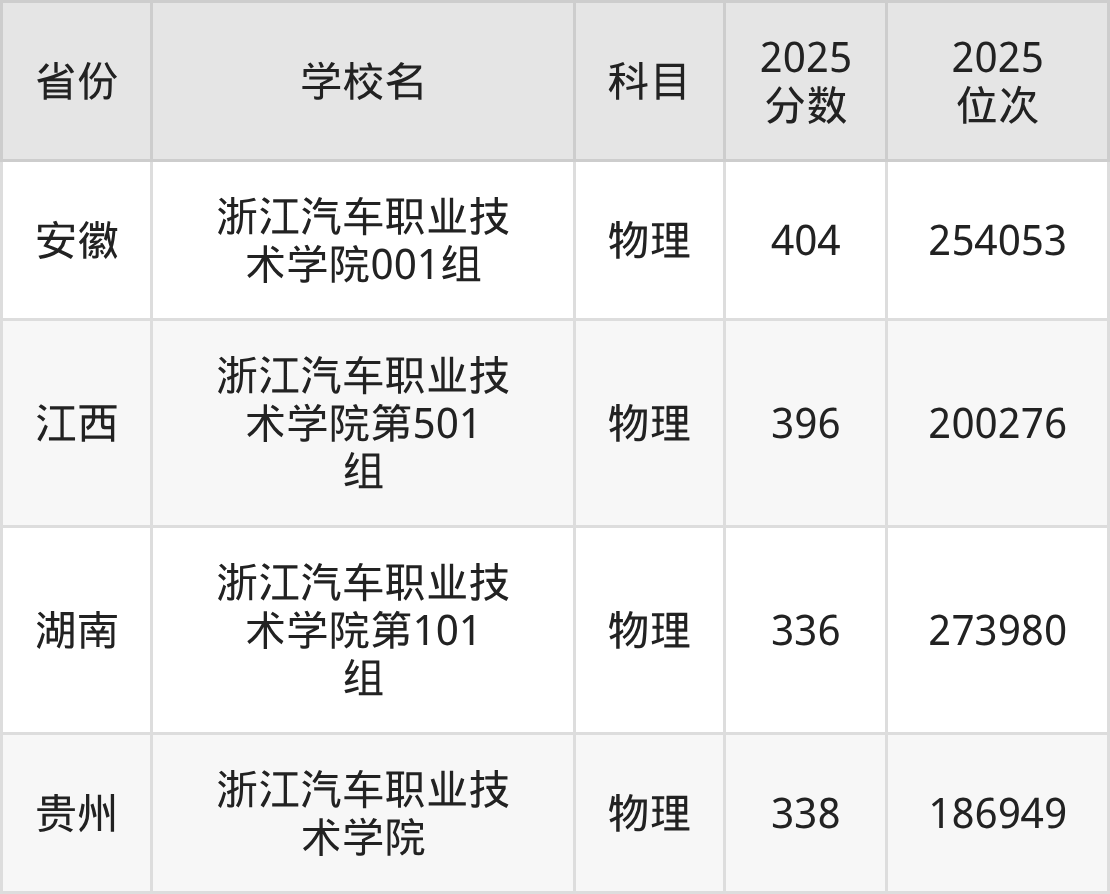 2026年浙江汽车职业技术学院录取分数线预计在390分及以上,在各省录取最低分存在一定差异,如:2025年浙江汽车职业技术学院在安徽录取最低物理类404分,在江西录取最低物理类396分,在湖南录取最低物理类336分。