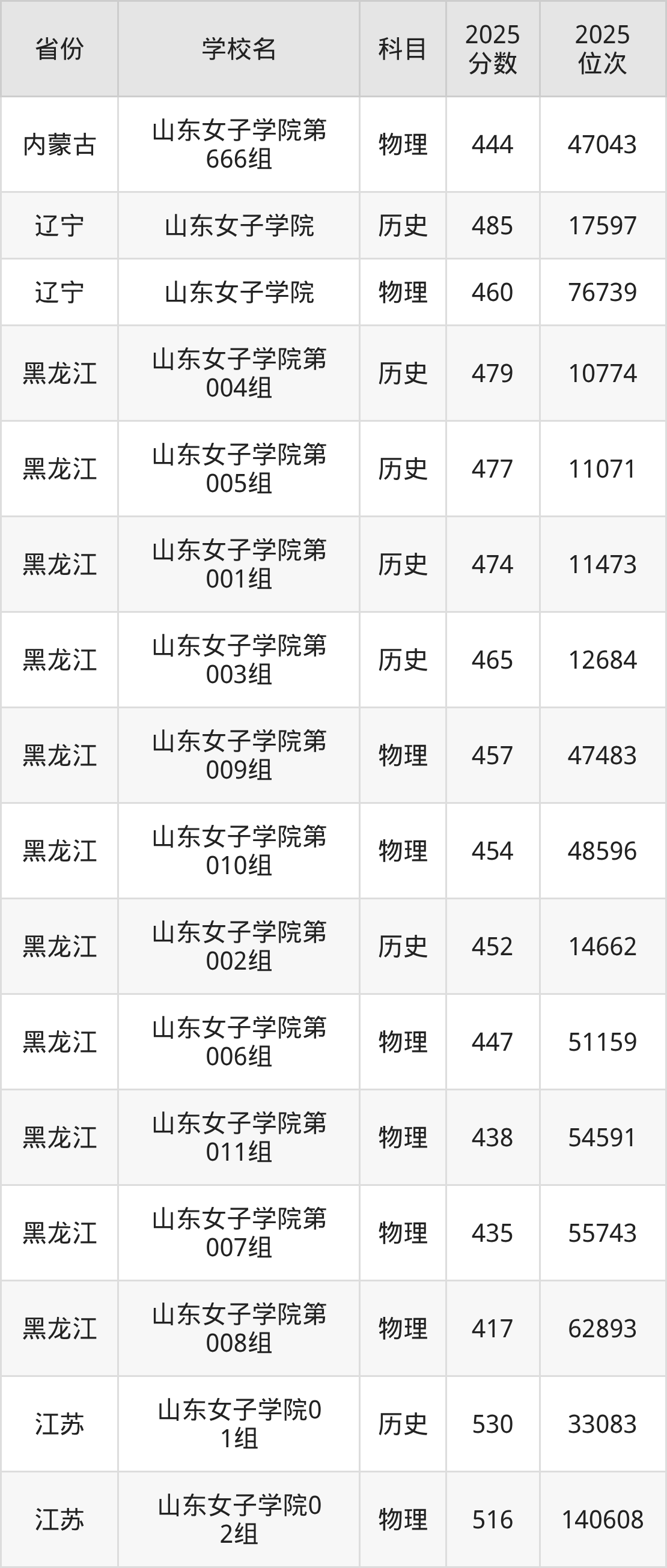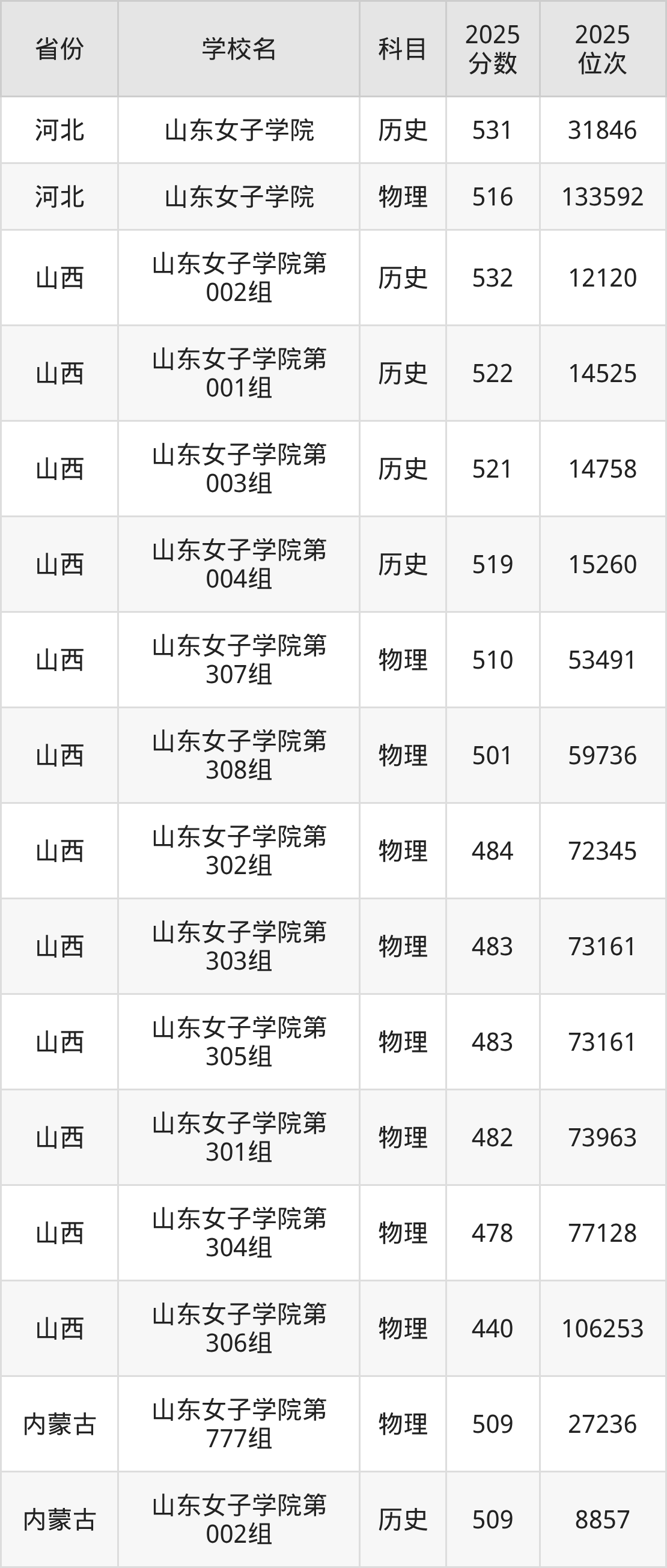 2025年山东女子学院在省外录取分数线范围整体位于417分到532分之间,录取分数线最低在黑龙江物理(第008组)、录取分数线最高在山西历史(第002组)。