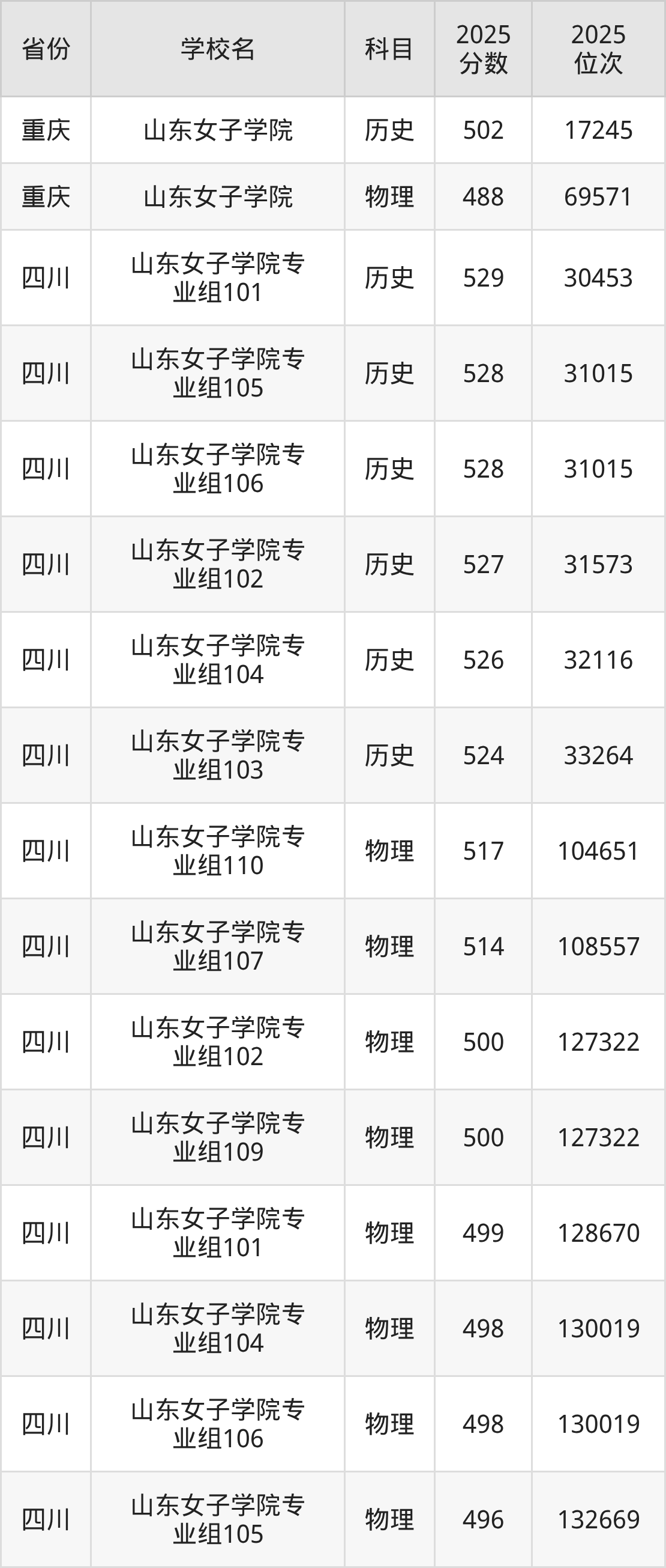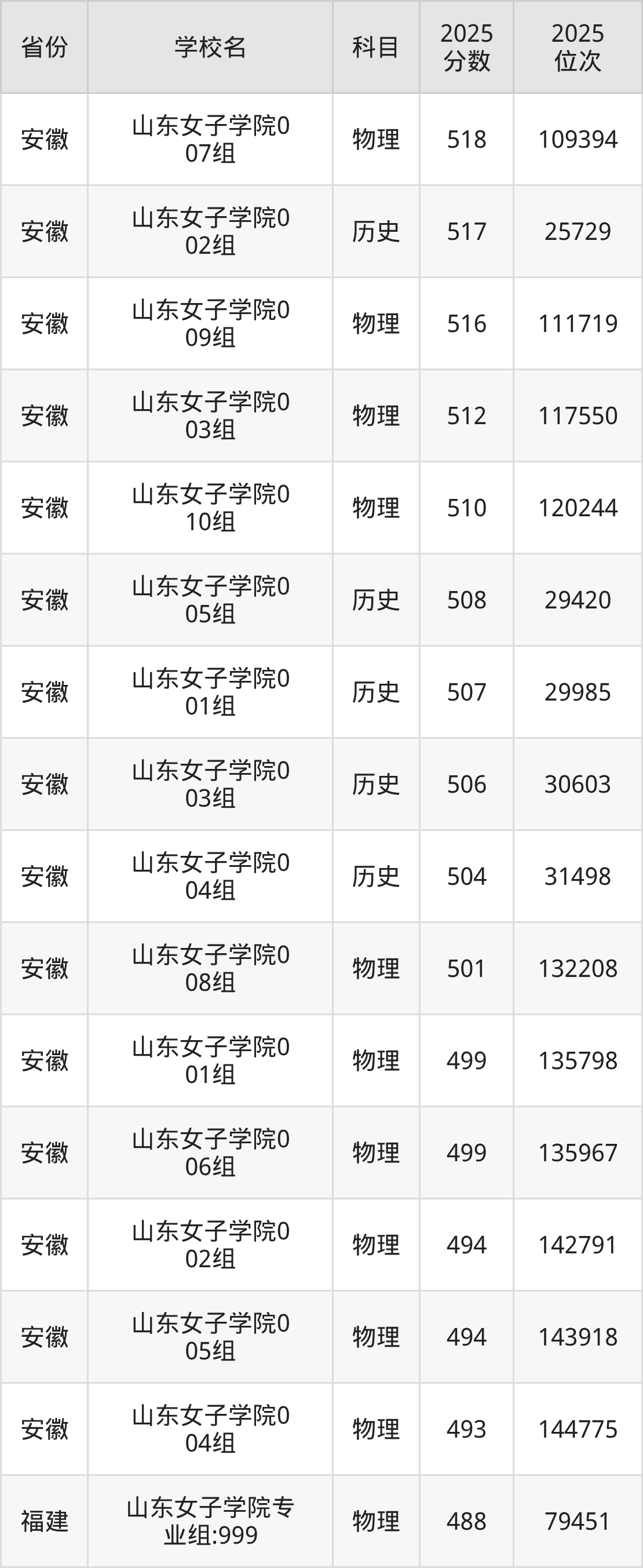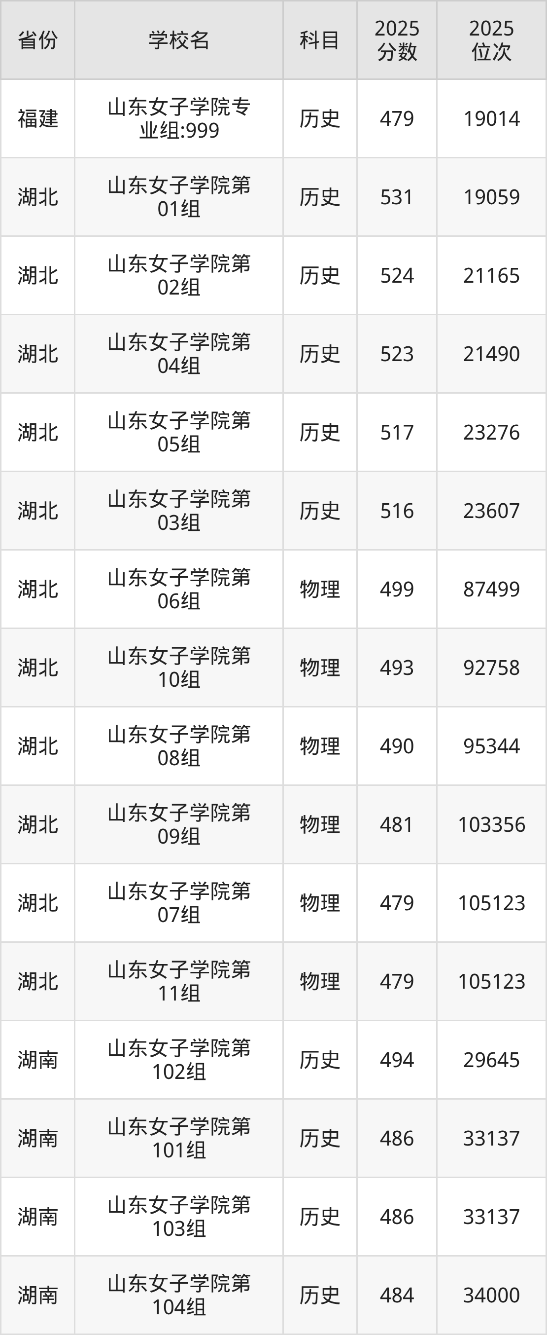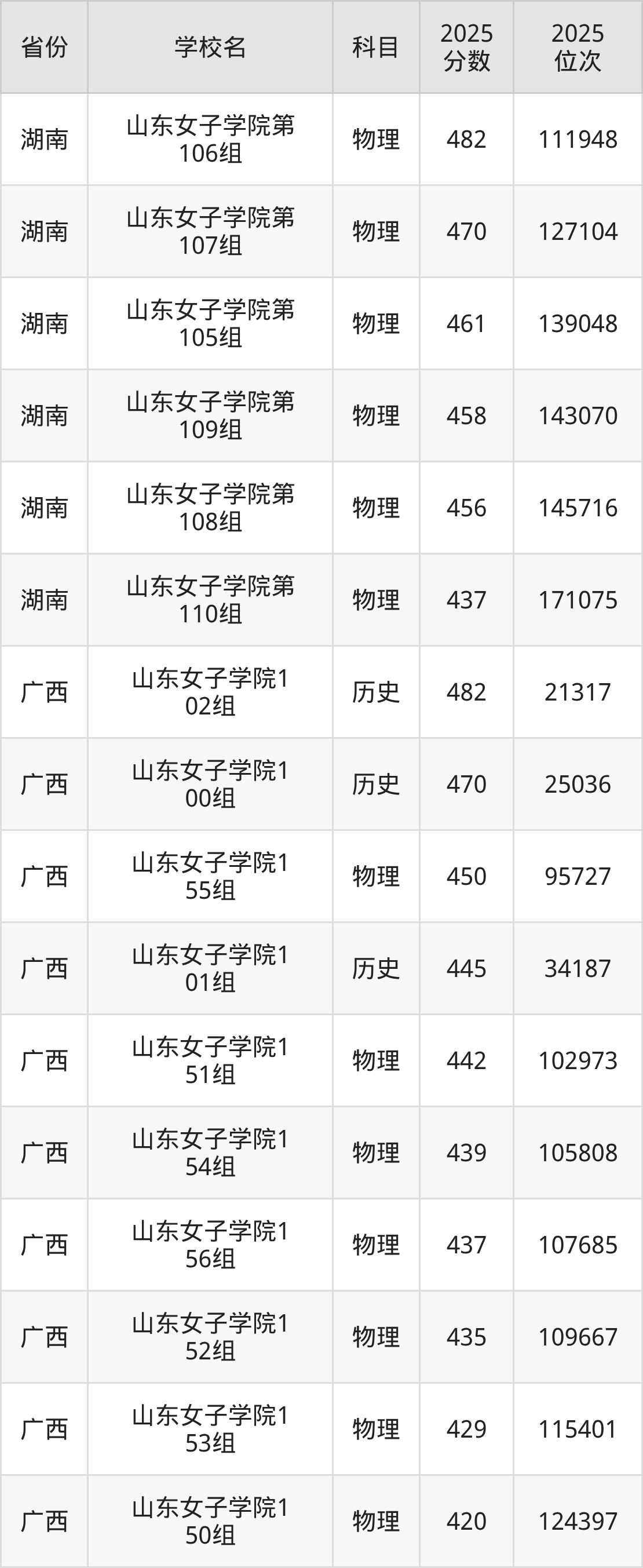 2026年山东女子学院录取分数线预计在480分及以上,在各省录取最低分存在一定差异,如:2025年山东女子学院在湖北录取最低历史类516分、物理类479分,在湖南录取最低历史类484分、物理类437分,在广西录取最低历史类445分、物理类420分。