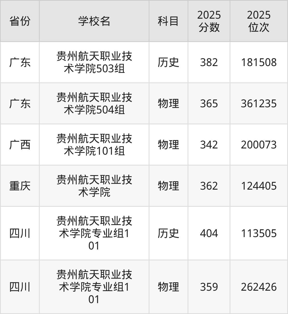 2025年贵州航天职业技术学院在省外录取分数线范围整体位于342分到404分之间,录取分数线最低在广西物理(101组)、录取分数线最高在四川历史(专业组101)。