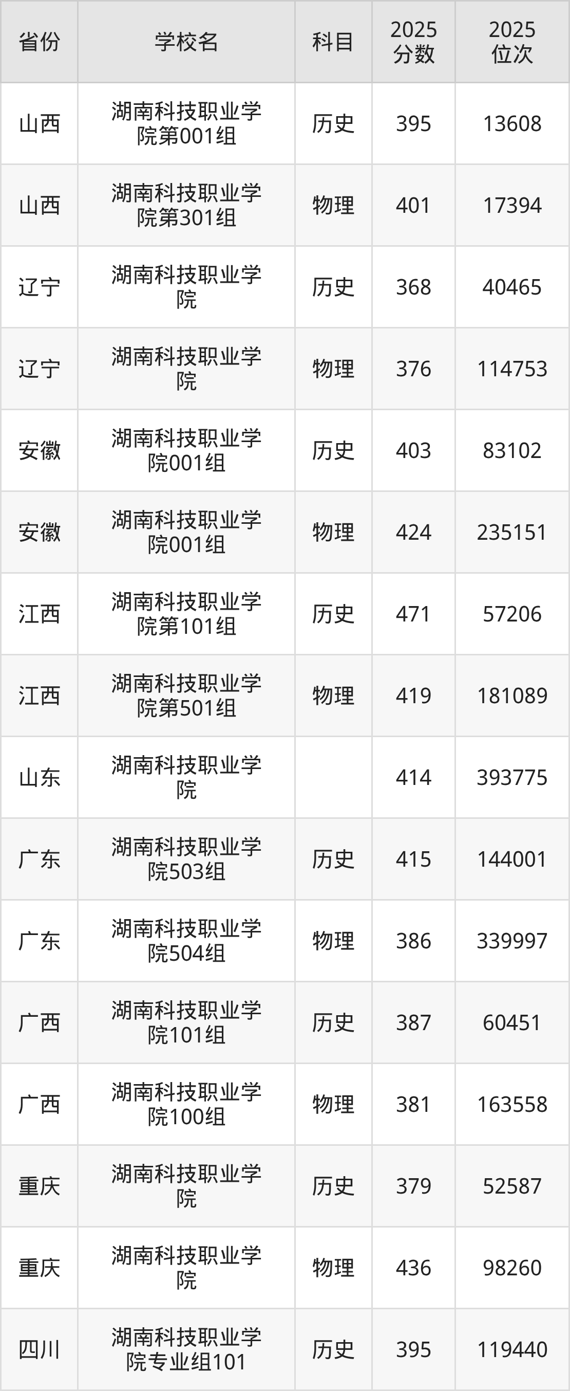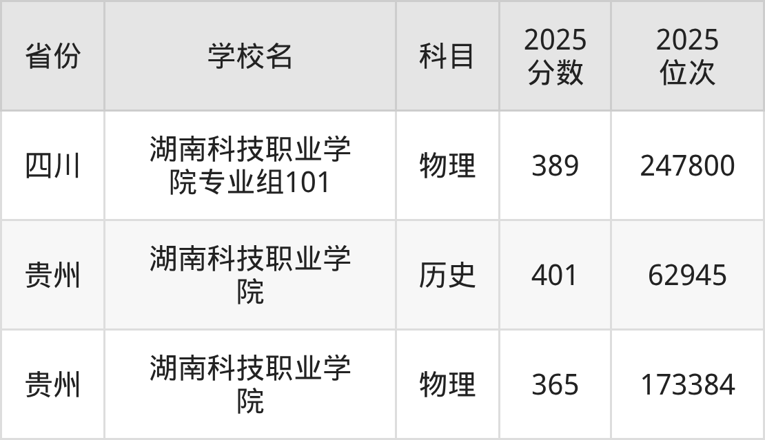 2025年湖南科技职业学院历史类最低分405分(75666名)、物理类最低分381分(237162名)。