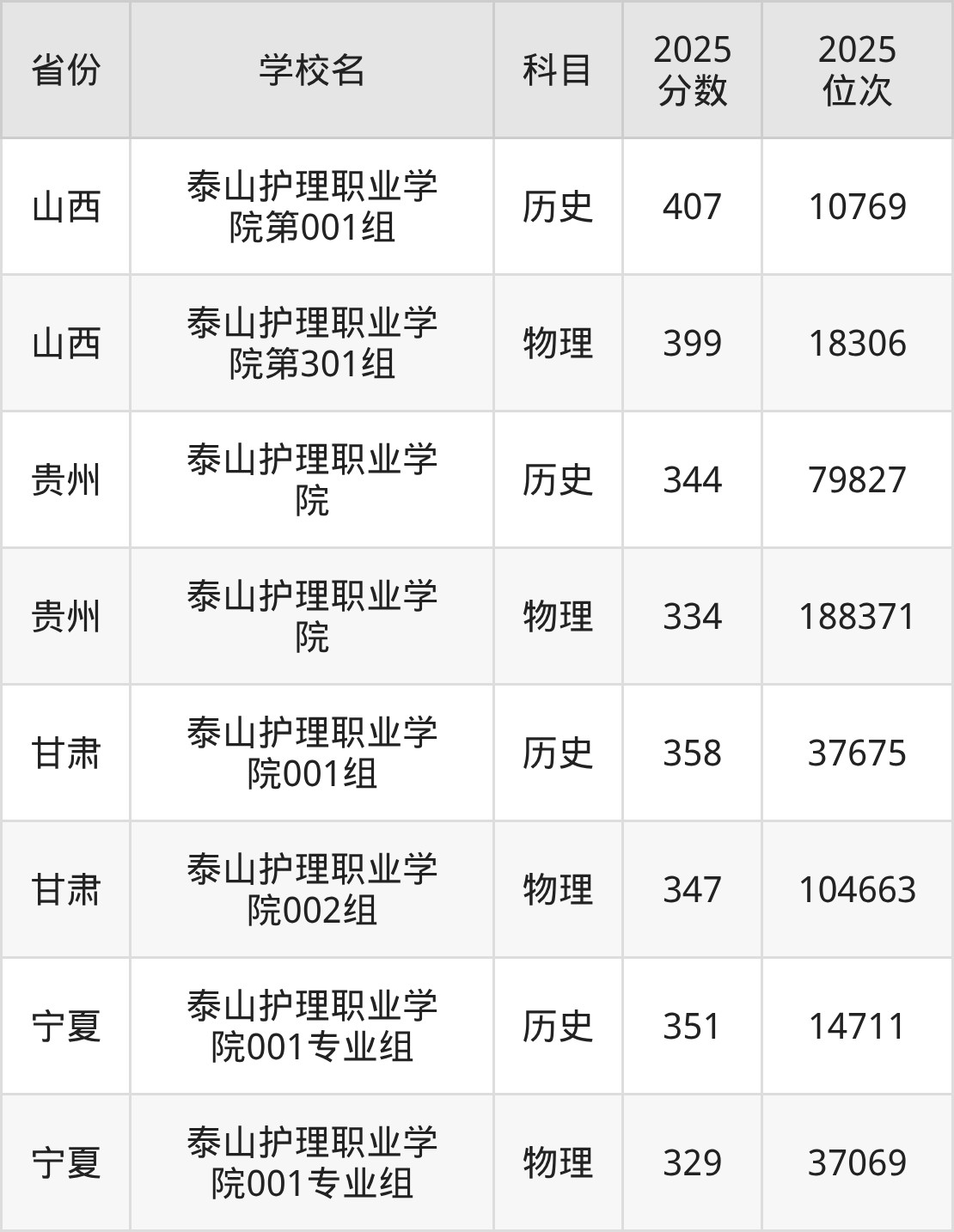 2026年泰山护理职业学院录取分数线预计在350分及以上,在各省录取最低分存在一定差异,如:2025年泰山护理职业学院在山西录取最低历史类407分、物理类399分,在山东录取最低分是332分,在贵州录取最低历史类344分、物理类334分。