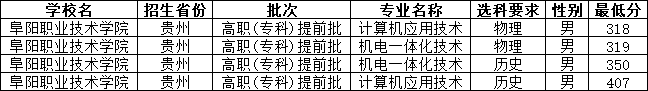 2024年阜阳职业技术学院在贵州招定向士官的分数范围在318分-407分之间,其中物理类最低分为318分(计算机应用技术);历史类最低分为350分(机电一体化技术)。