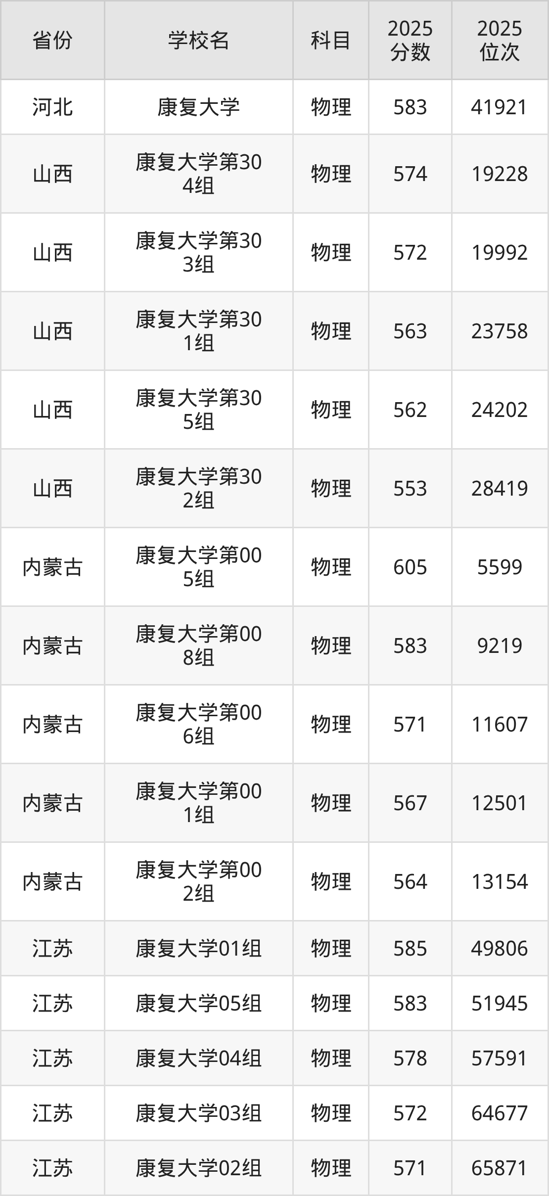 2025年康复大学在省外录取分数线范围整体位于540分到605分之间,录取分数线最低在湖南物理(第108组)、录取分数线最高在内蒙古物理(第005组)。