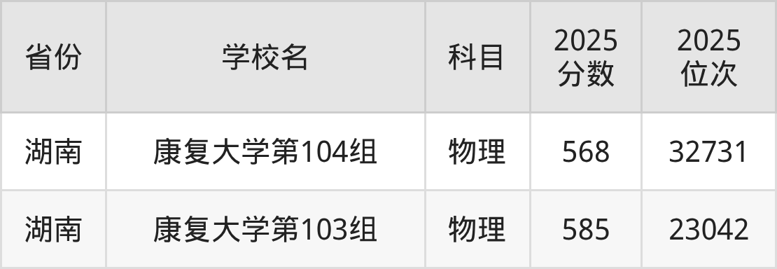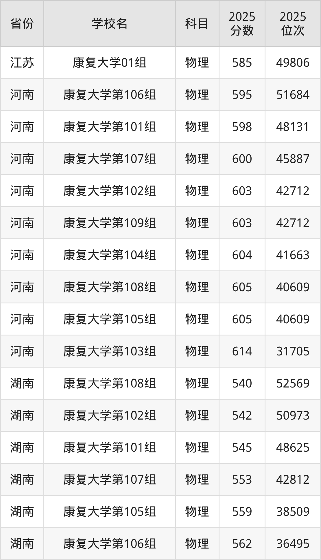 2025年康复大学在省外录取分数线范围整体位于540分到614分之间,录取分数线最低在湖南物理(第108组)、录取分数线最高在河南物理(第103组)。