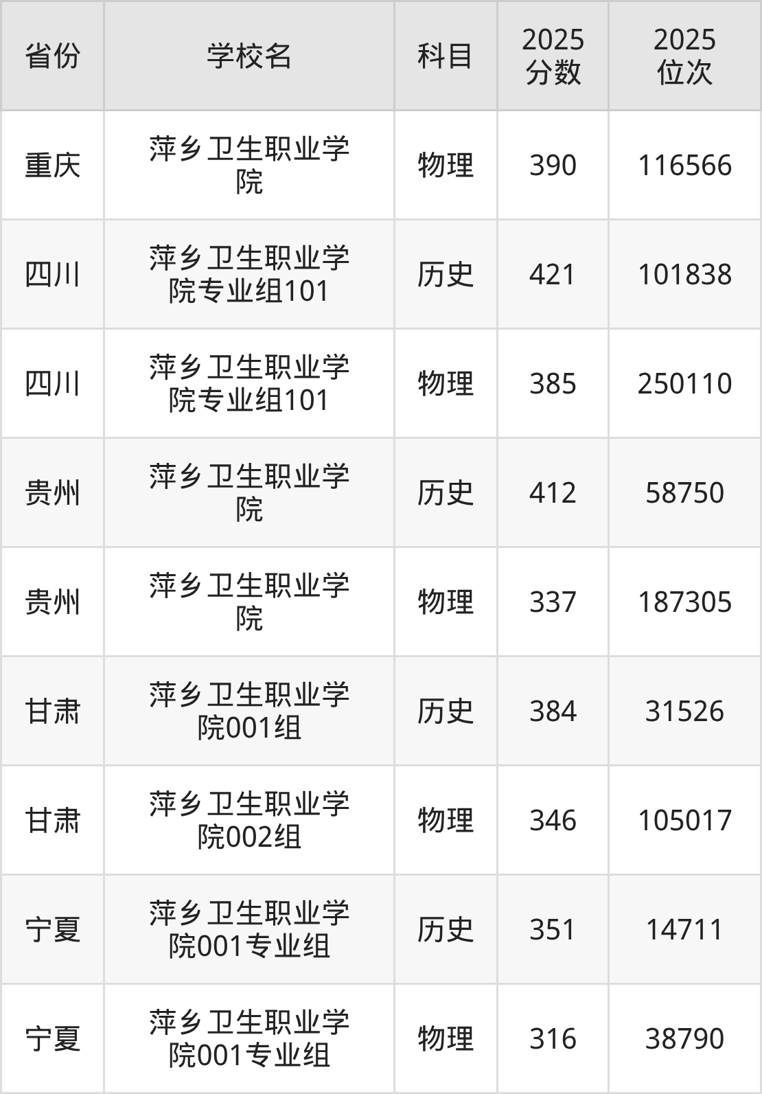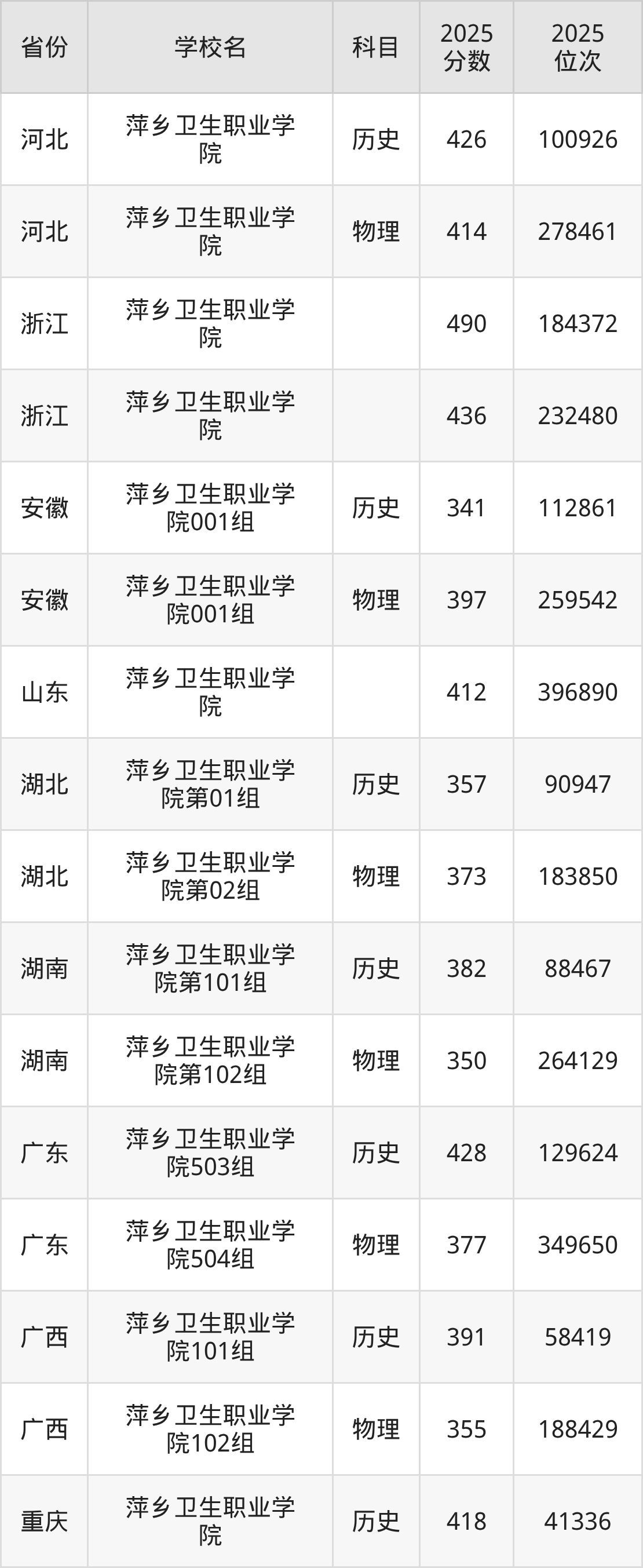 2025年萍乡卫生职业学院历史类最低分444分(75079名)、物理类最低分240分(259802名)。