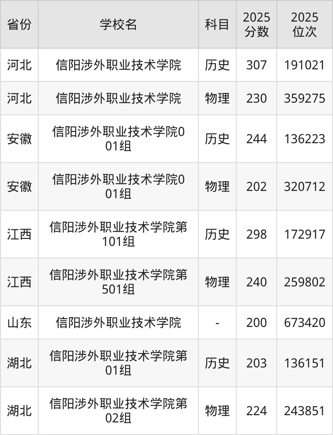 2025年信阳涉外职业技术学院历史类最低分298分(172917名)、物理类最低分240分(259802名)。