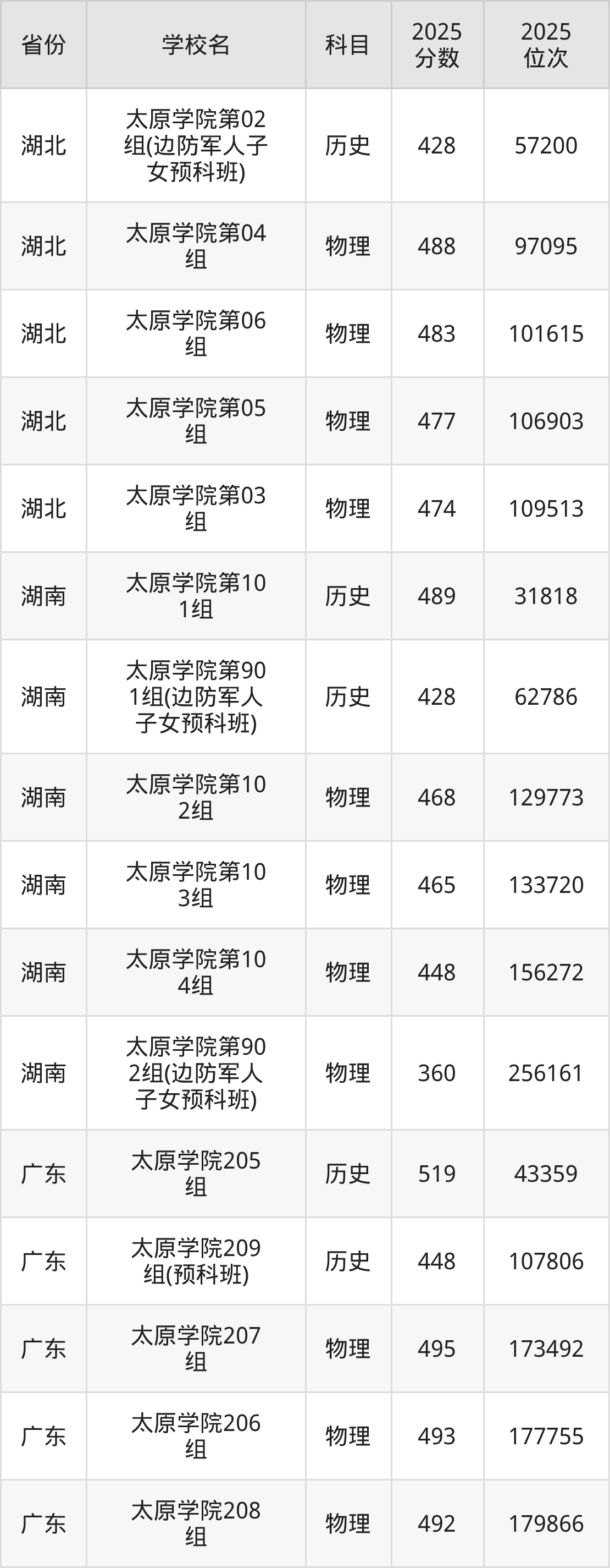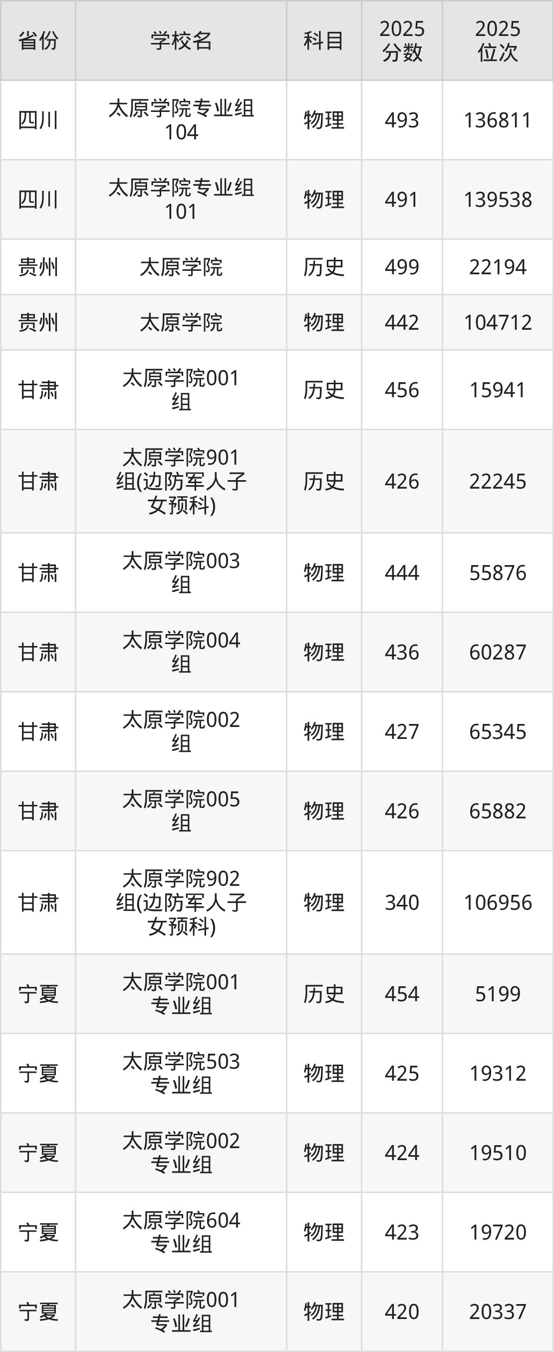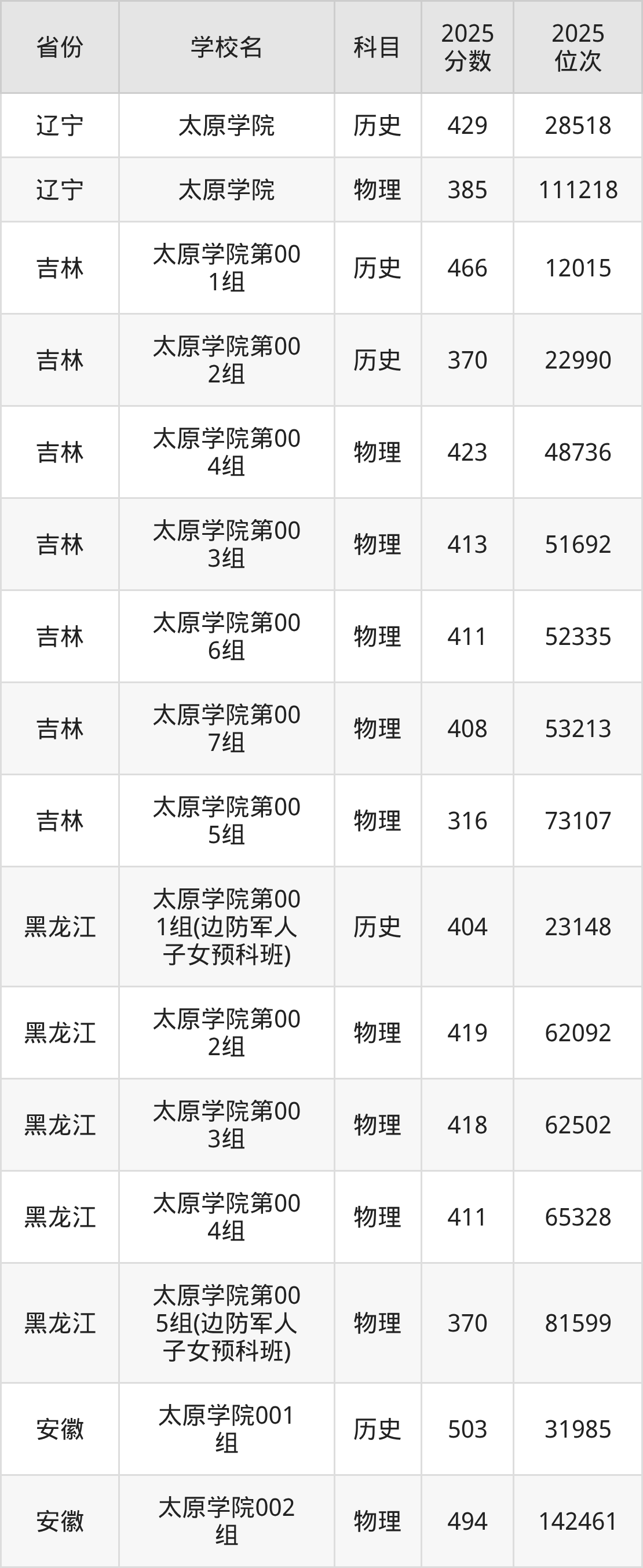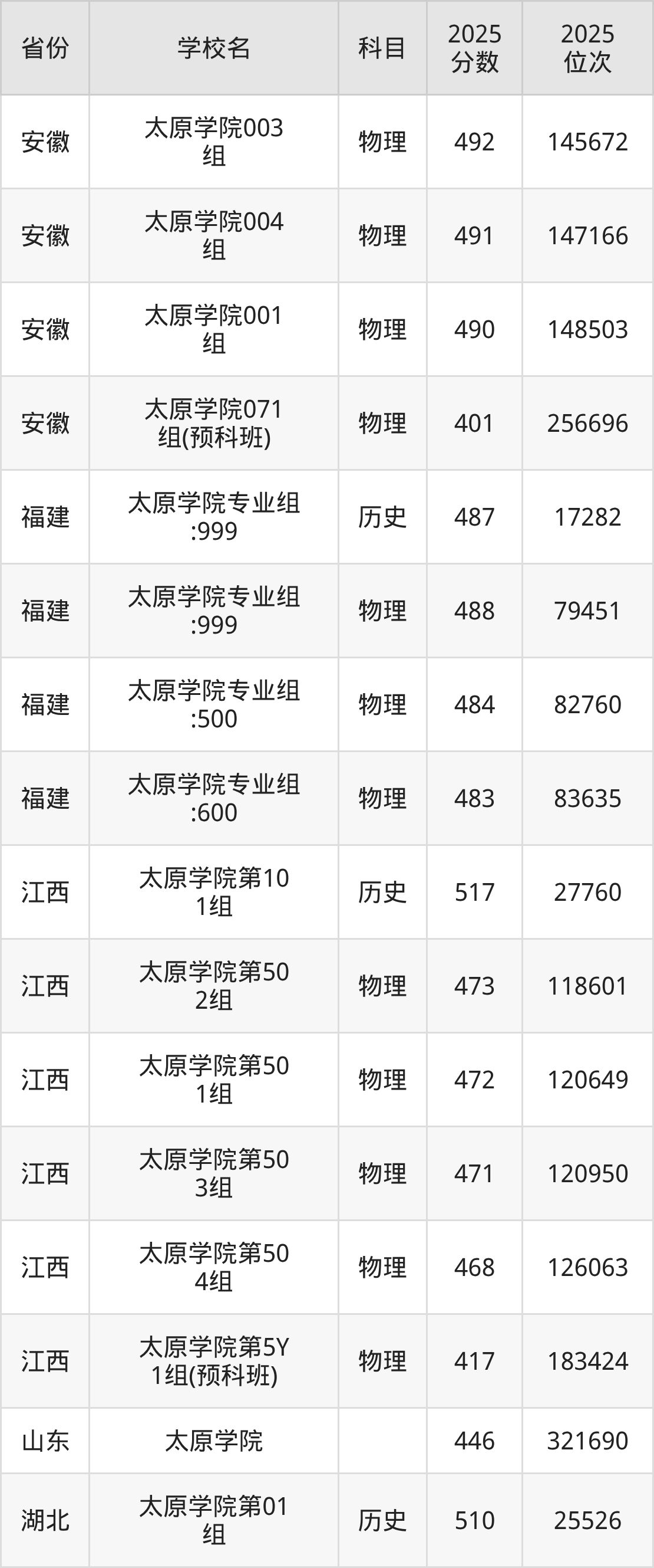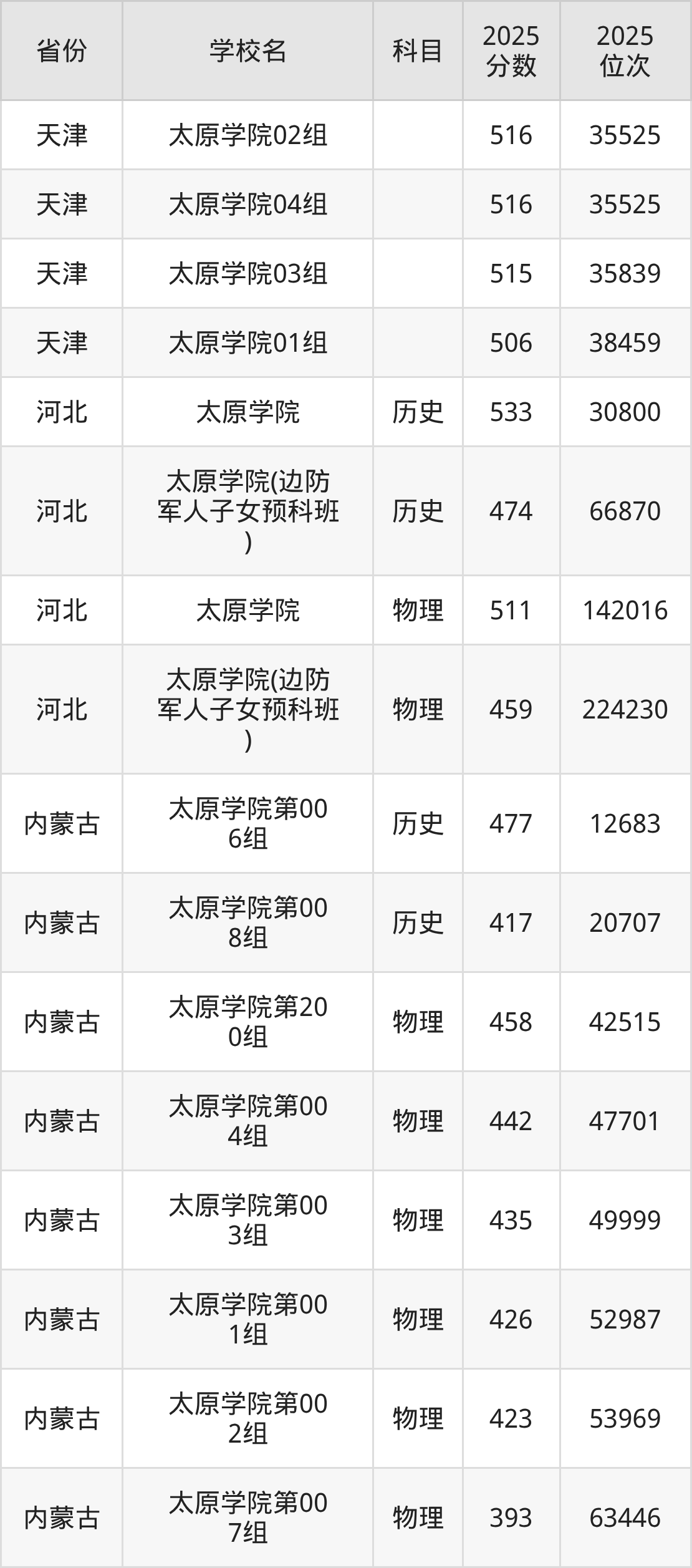 2025年太原学院在省内分历史物理科目类录取,其中历史类最低分是489分、对应位次是23434名;物理类最低分是461分,对应位次是90514名。