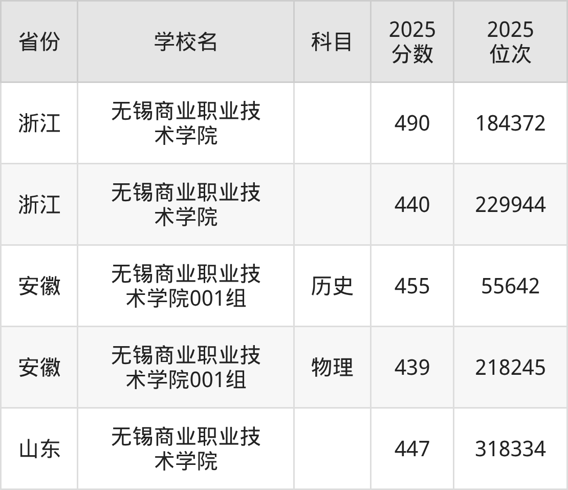 2025年无锡商业职业技术学院历史类最低分435分(17034名)、物理类最低分369分(54634名)。
