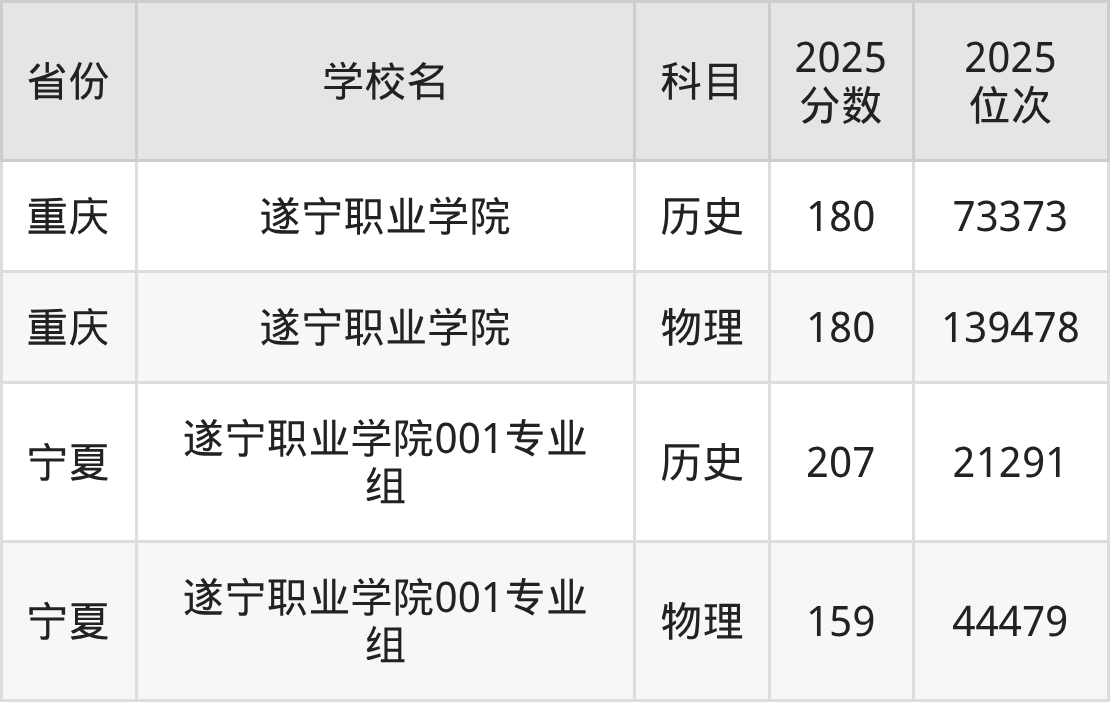 2025年遂宁职业学院在省内,其中历史类最低分是150分、对应位次是177978名;物理类最低分是150分,对应位次是284789名。