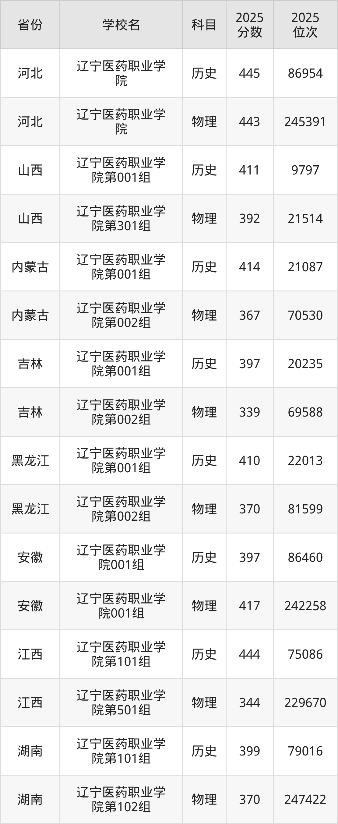 2025年辽宁医药职业学院历史类最低分408分(32642名)、物理类最低分399分(105501名)。