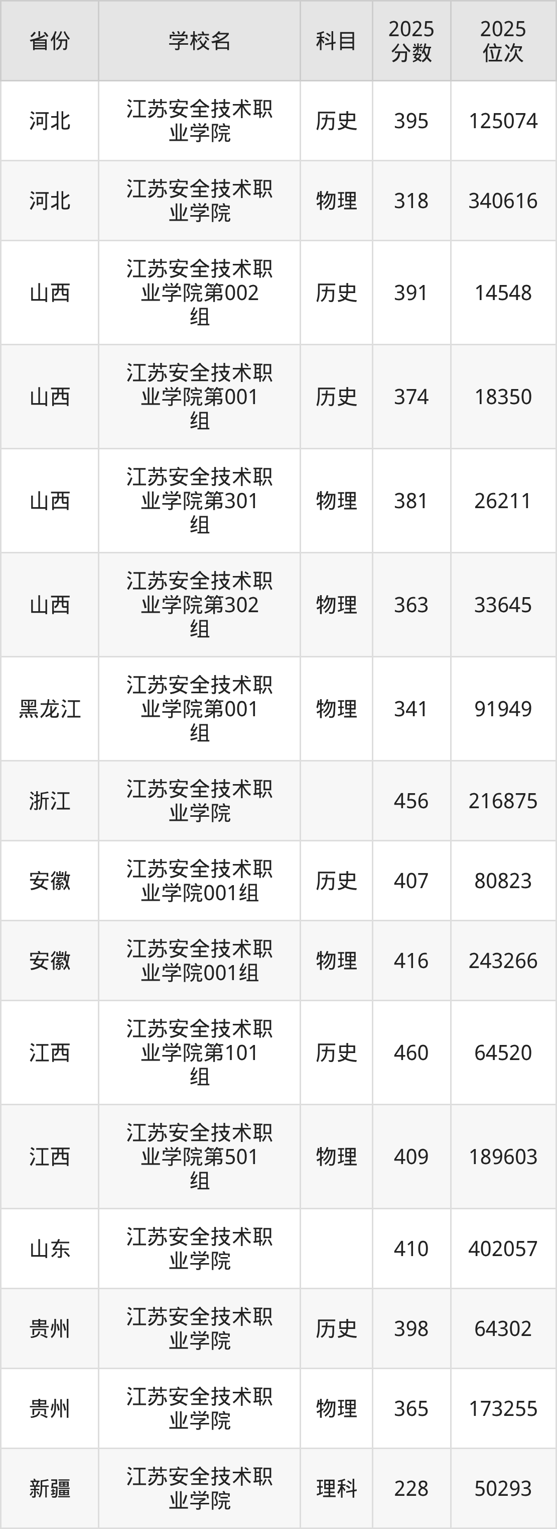 2026年江苏安全技术职业学院录取分数线预计在400分及以上,在各省录取最低分存在一定差异,如:2025年江苏安全技术职业学院在江西录取最低历史类460分、物理类409分,在山东录取最低分是410分,在新疆录取最低理科228分。