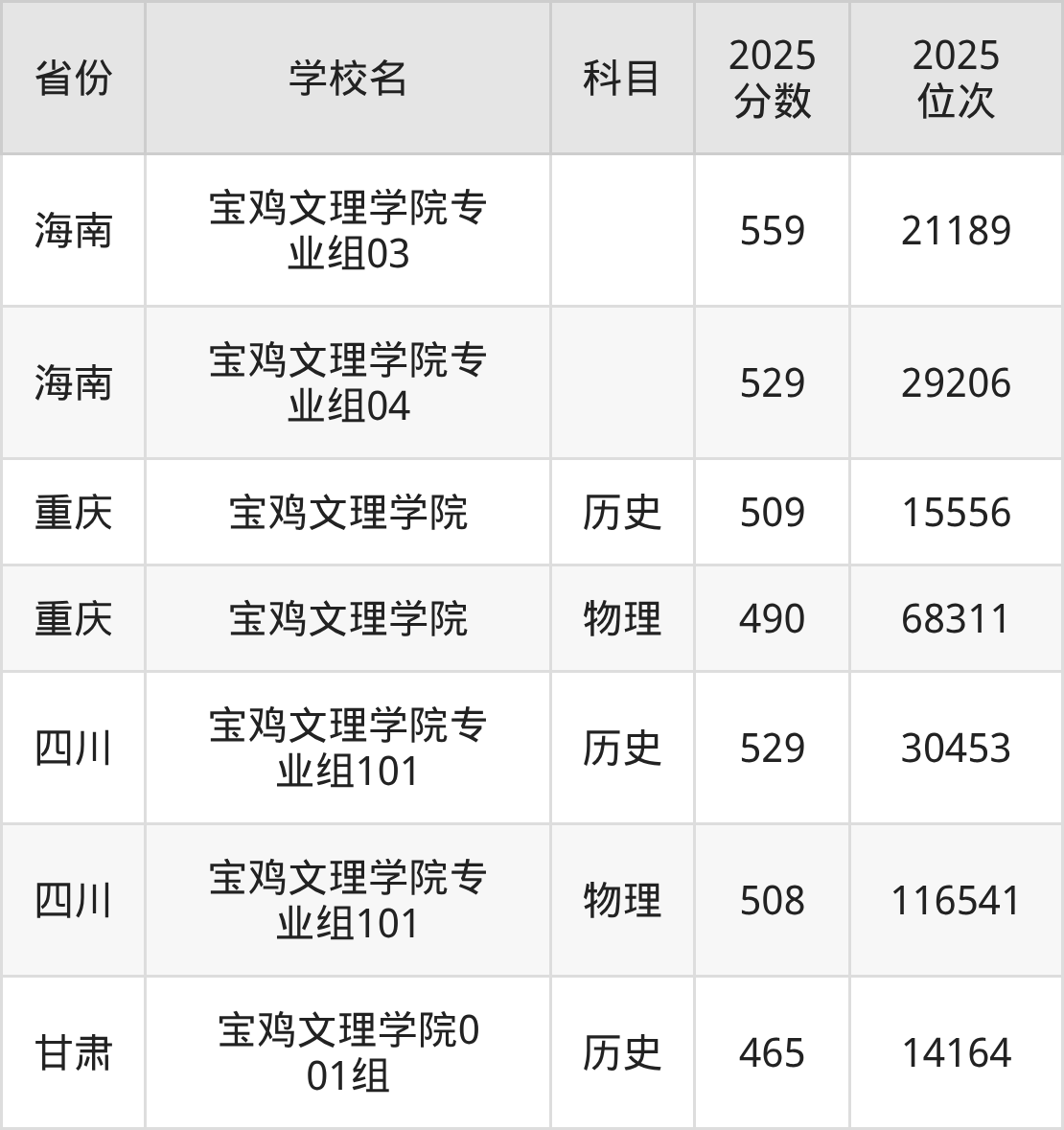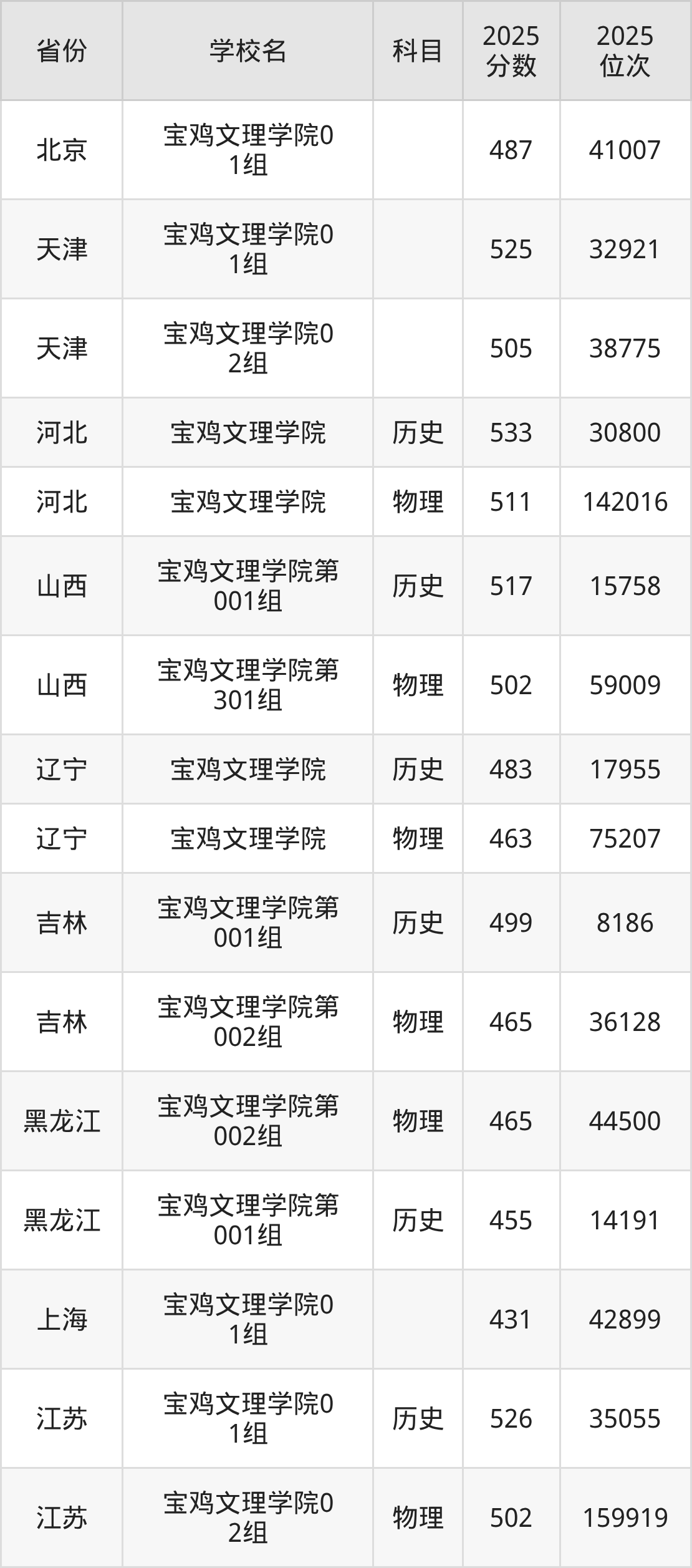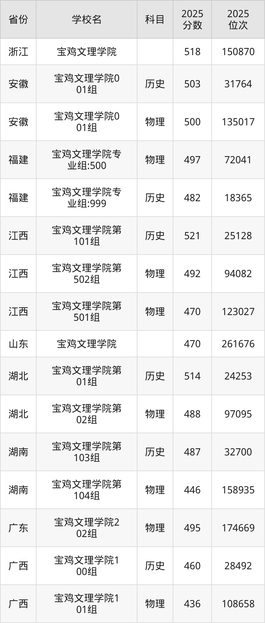 下面是宝鸡文理学院2025年录取分数线各省汇总,一起来了解下吧。