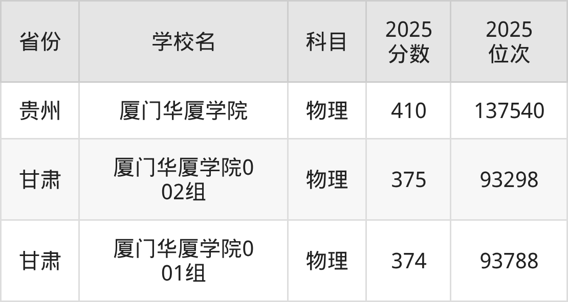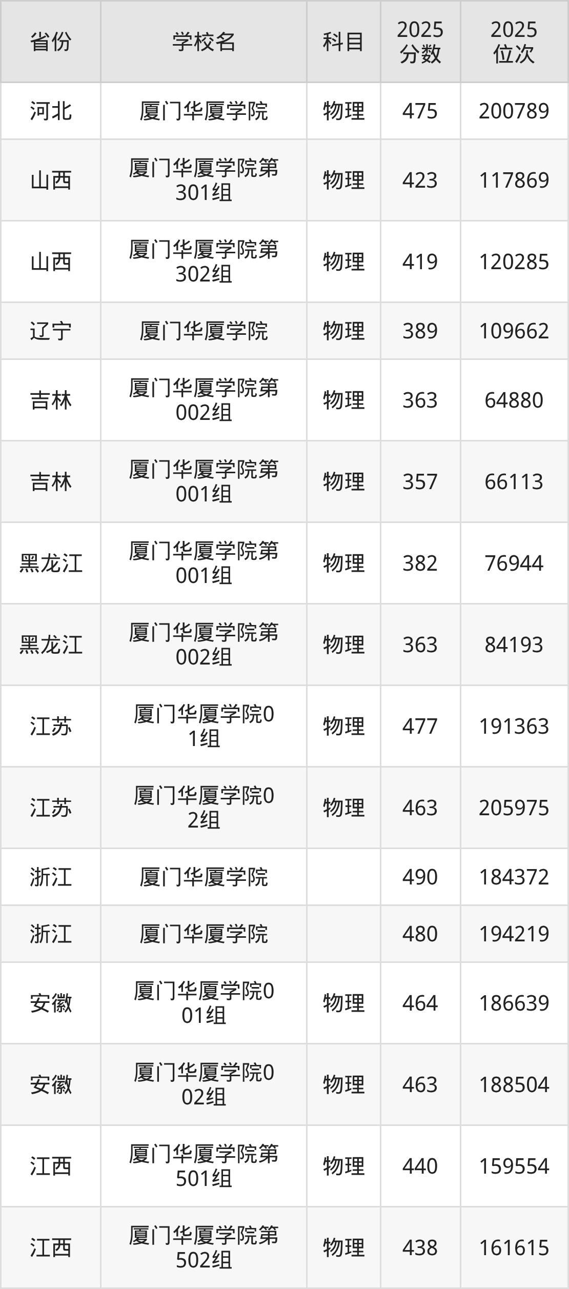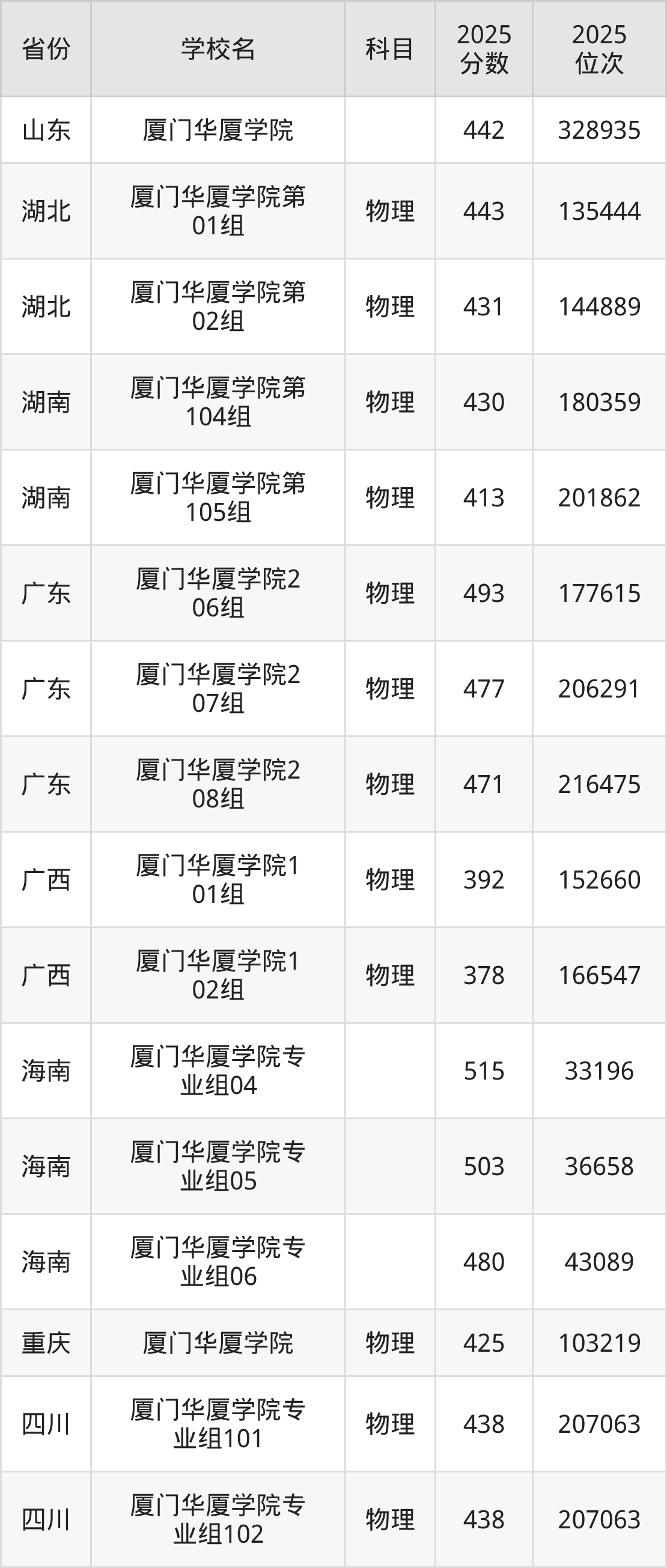 2025年厦门华厦学院历史类最低分450分(25562名)、物理类最低分441分(119155名)。