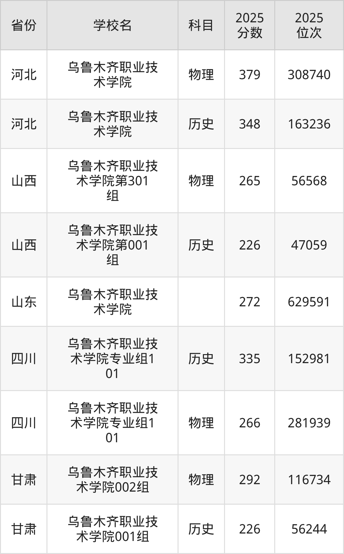 2025年乌鲁木齐职业技术学院在维吾尔自治区外录取分数线范围整体位于226分到379分之间,录取分数线最低在山西历史(第001组)、录取分数线最高在河北物理。