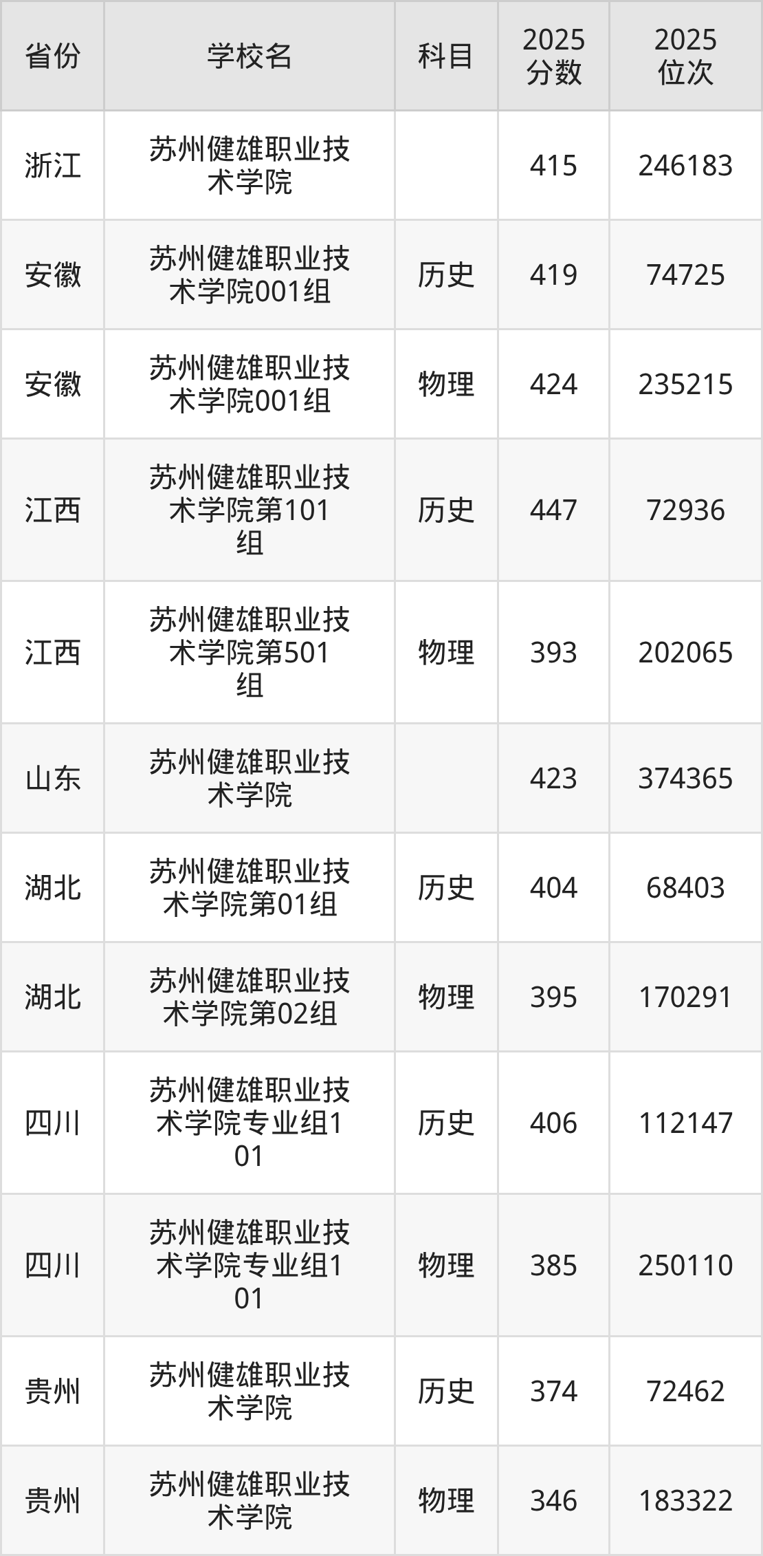 2025年苏州健雄职业技术学院历史类最低分308分(40427名)、物理类最低分329分(59701名)。