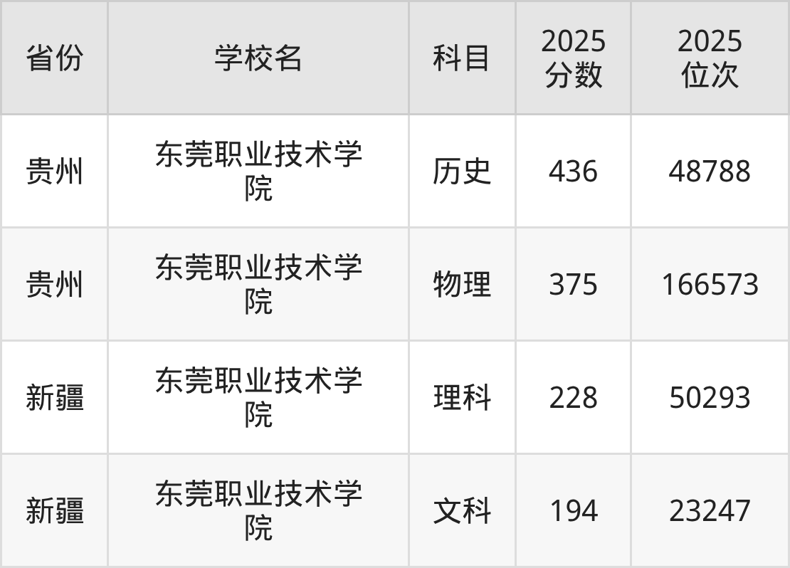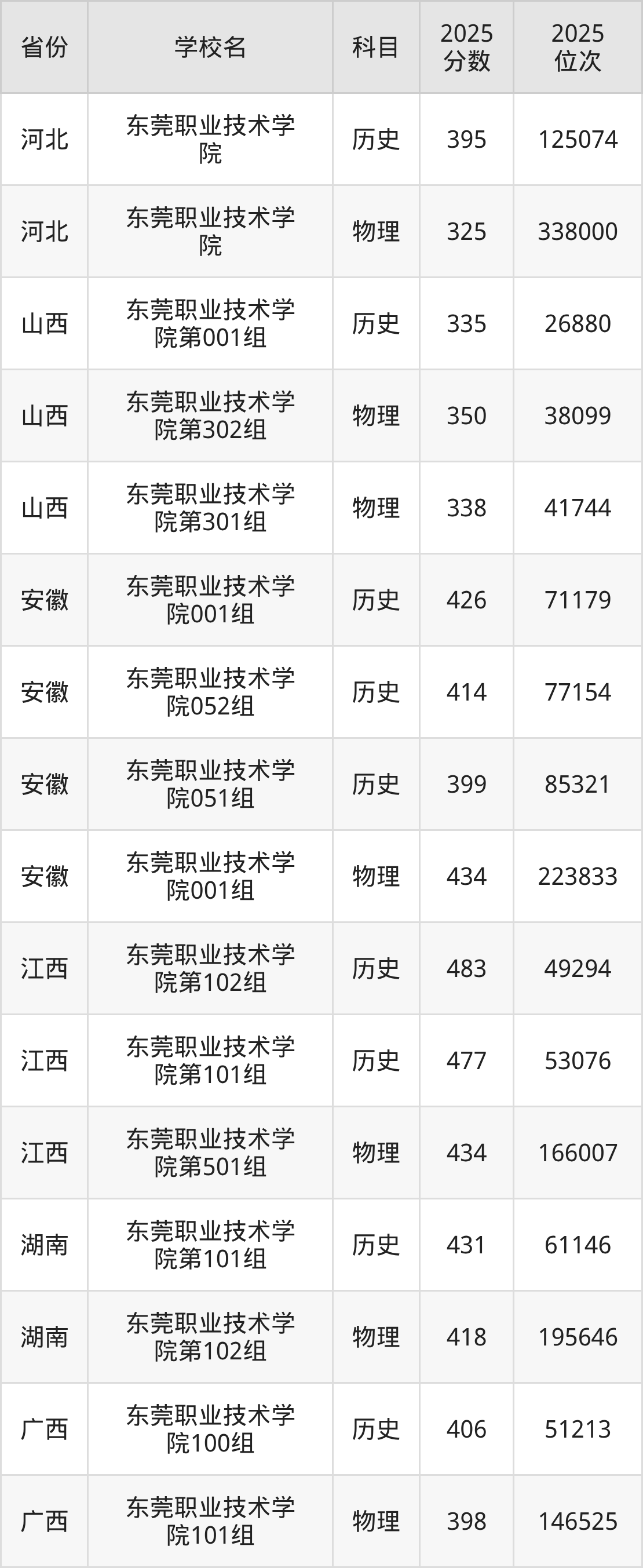 2025年东莞职业技术学院在省内分历史物理科目类录取,其中历史类最低分是418分、对应位次是140948名;物理类最低分是406分,对应位次是316554名。