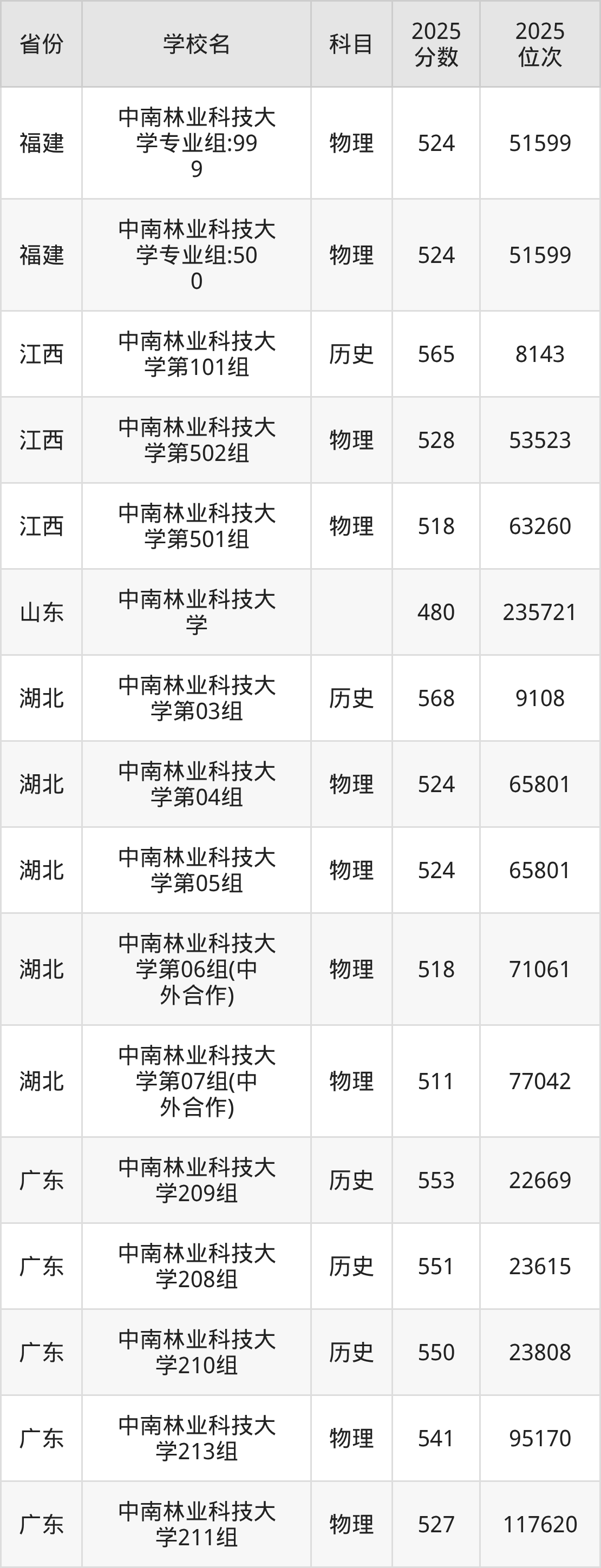 | 中南林业科技大 学第320组( 国家专项) | 物理 | 516 | 74057 |