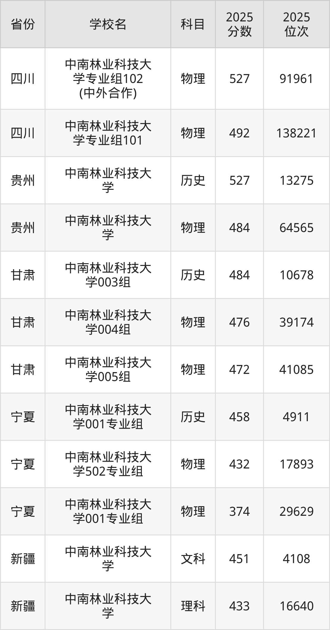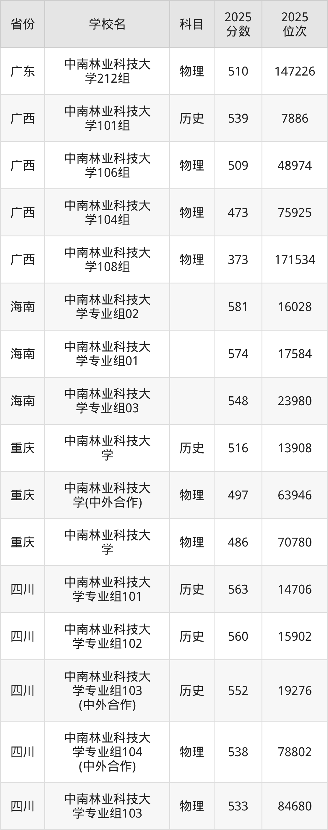 2025年中南林业科技大学在省内分历史物理科目类录取,其中历史类最低分是513分、对应位次是22014名;物理类最低分是471分,对应位次是125833名。