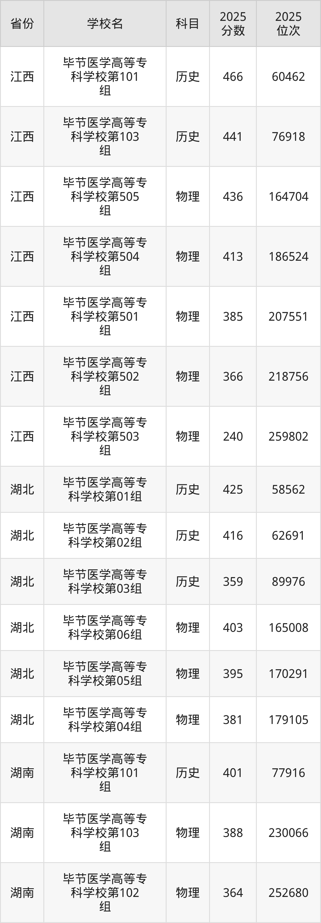 下面是毕节医学高等专科学校2025年录取分数线各省汇总,一起来了解下吧。