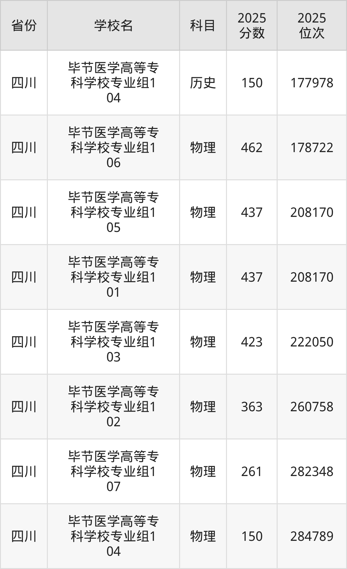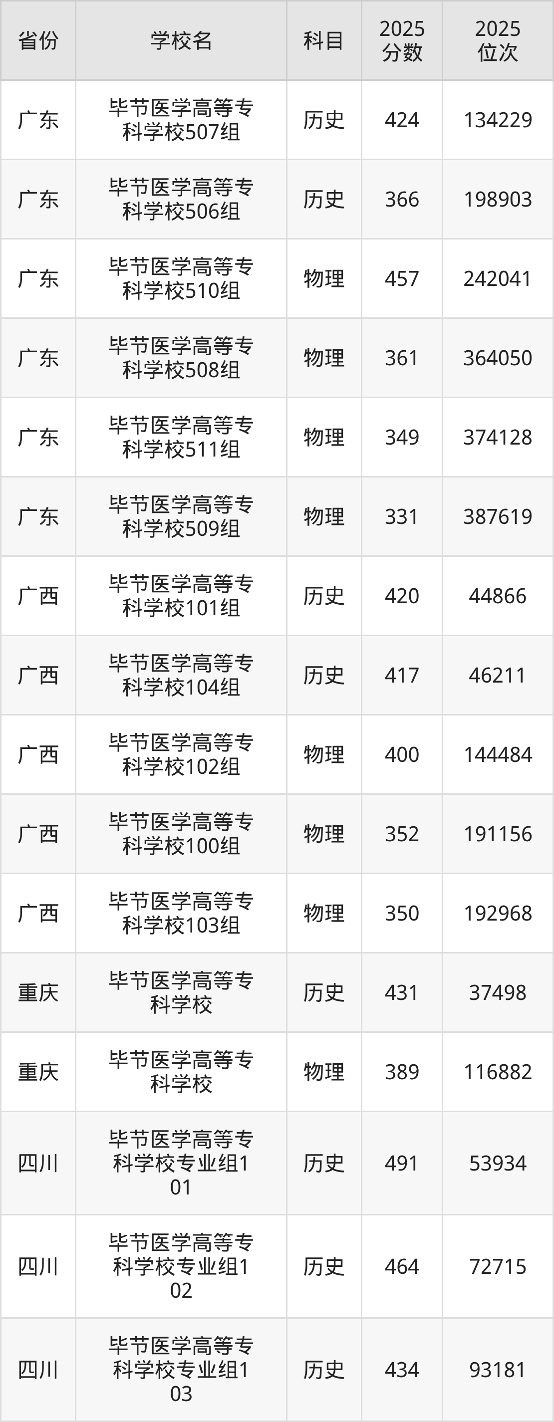 2025年毕节医学高等专科学校历史类最低分405分(61680名)、物理类最低分328分(190542名)。