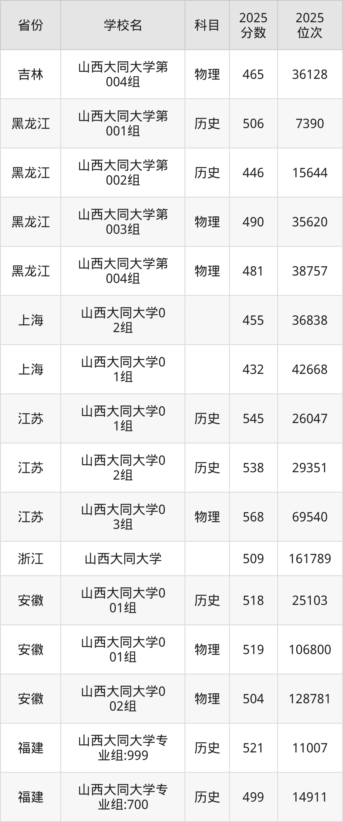 | 山西大同大学第 011组(地方 专项) | 历史 | 498 | 20809 |