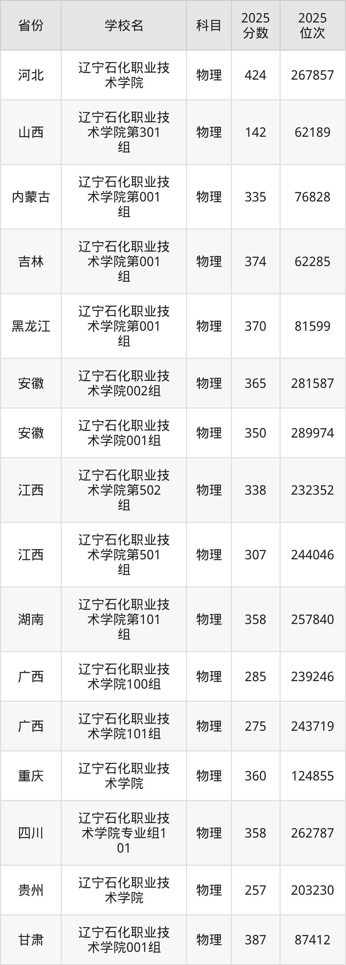 | 辽宁石化职业技 术学院 | 物理 | 289 | 136808 |
