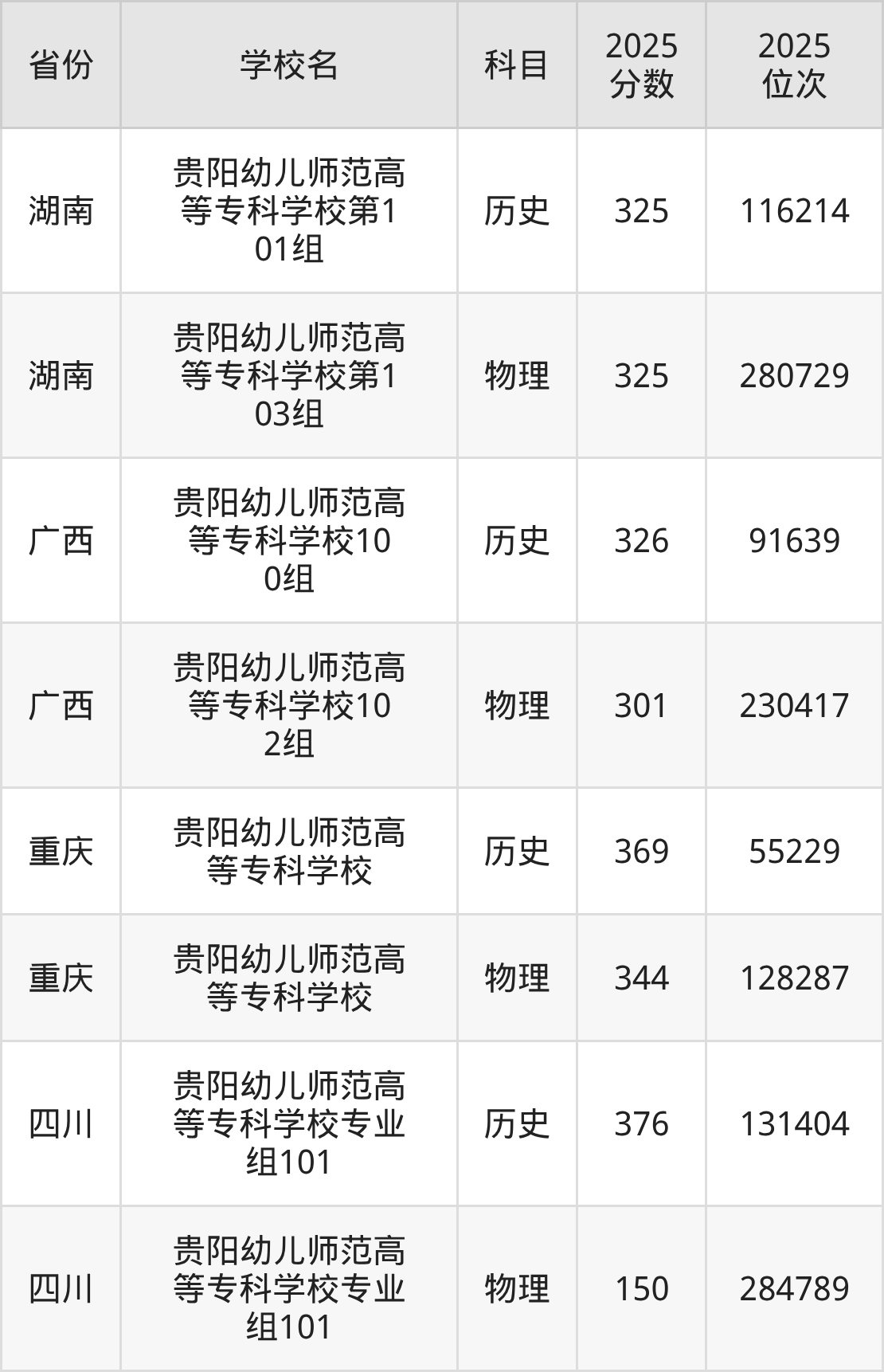 2025年贵阳幼儿师范高等专科学校在省内分历史物理科目类录取,其中历史类最低分是379分、对应位次是70793名;物理类最低分是317分,对应位次是193923名。