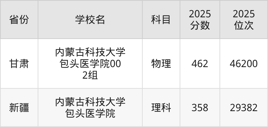 2025年内蒙古科技大学包头医学院在自治区外录取分数线范围整体位于358分到547分之间,录取分数线最低在新疆理科、录取分数线最高在四川物理(专业组101)。