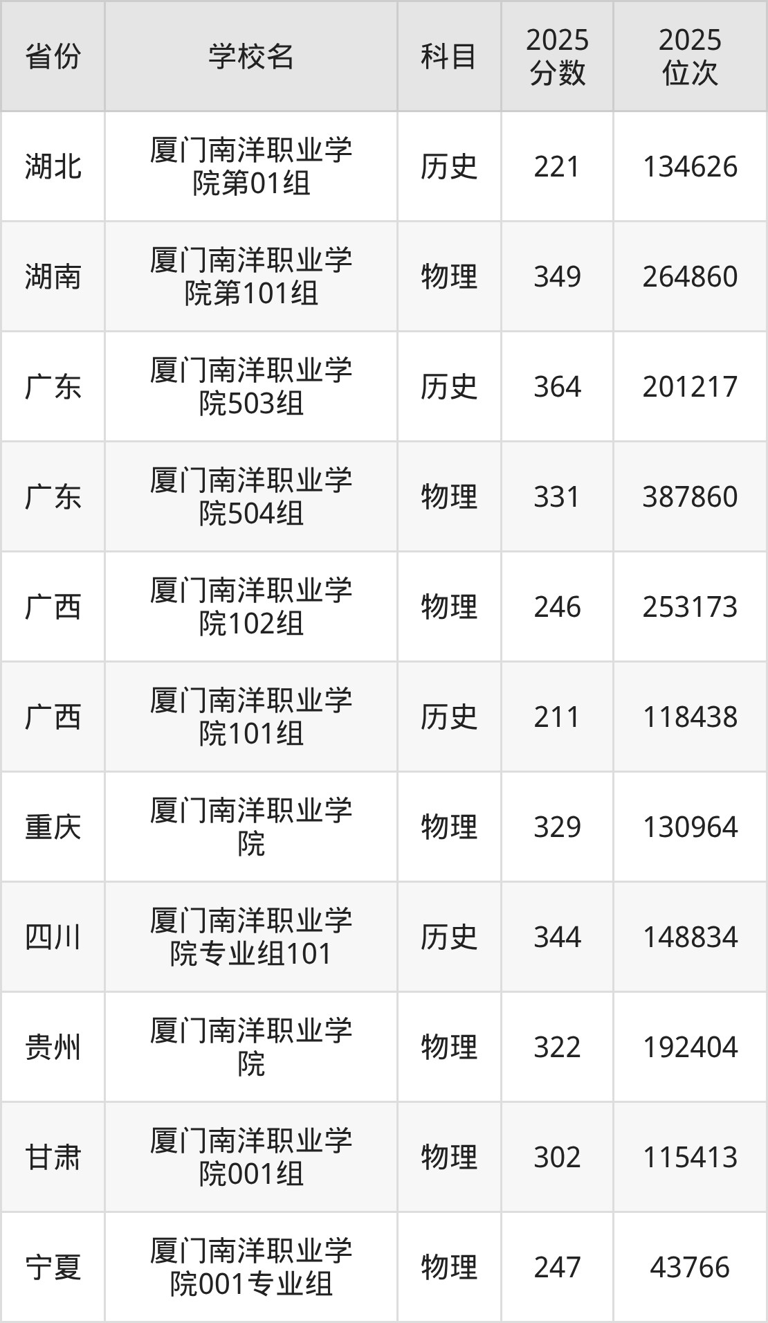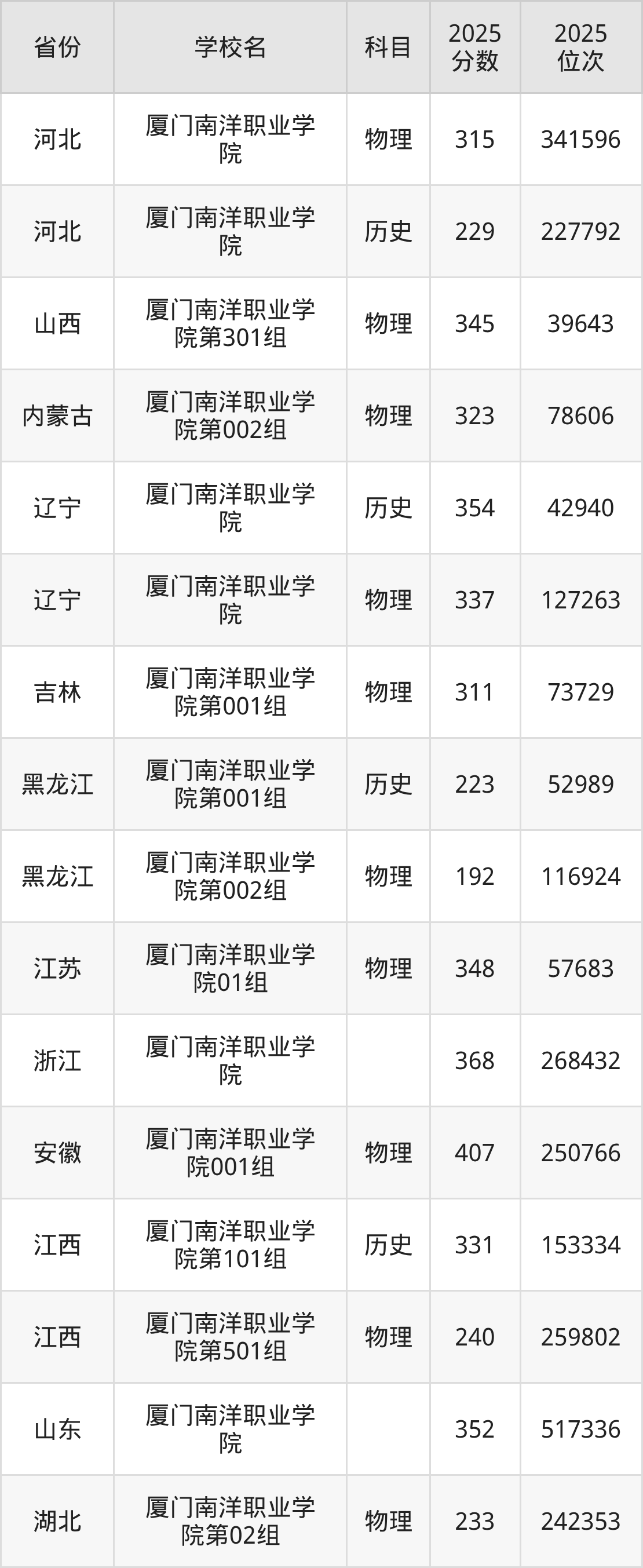 下面是厦门南洋职业学院2025年录取分数线各省汇总,一起来了解下吧。