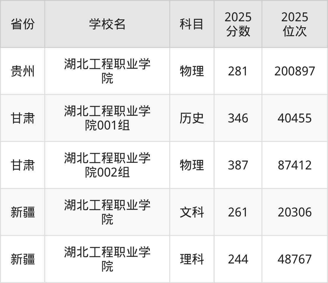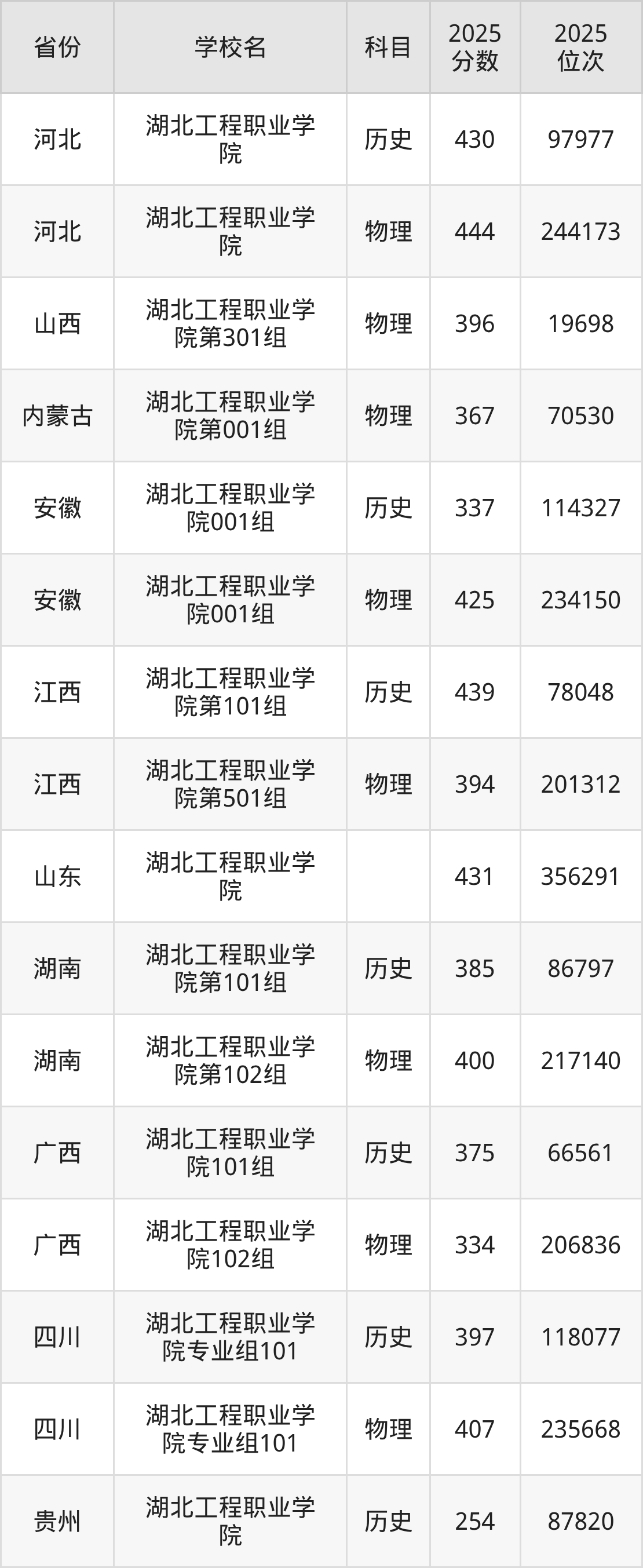 2025年湖北工程职业学院在省内分历史物理科目类录取,其中历史类最低分是350分、对应位次是94437名;物理类最低分是369分,对应位次是186199名。