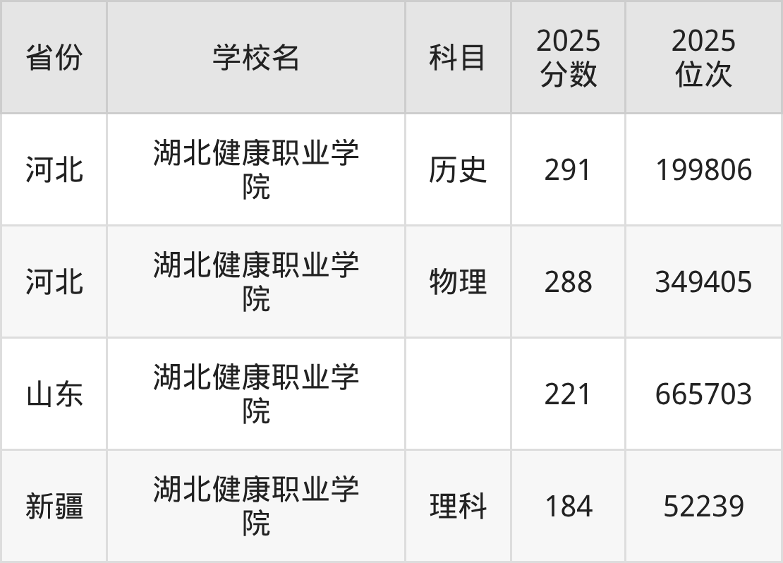 2025年湖北健康职业学院历史类最低分153分(138098名)、物理类最低分151分(247740名)。