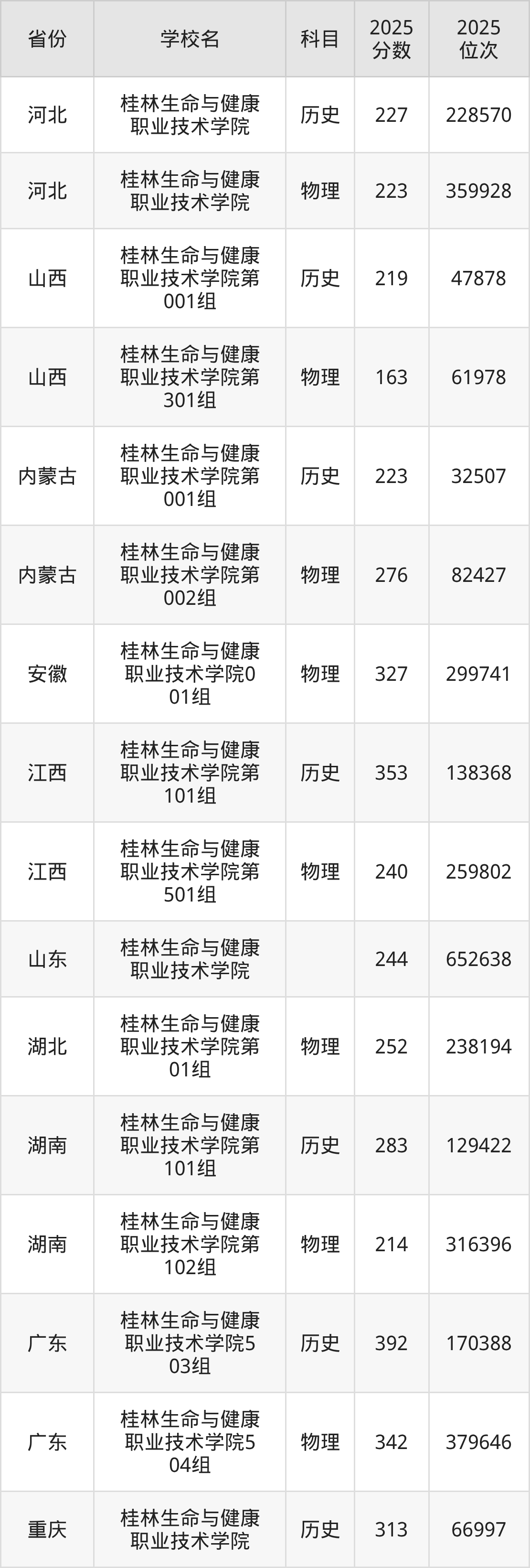 | 桂林生命与健康 职业技术学院1 01组 | 历史 | 291 | 105017 |