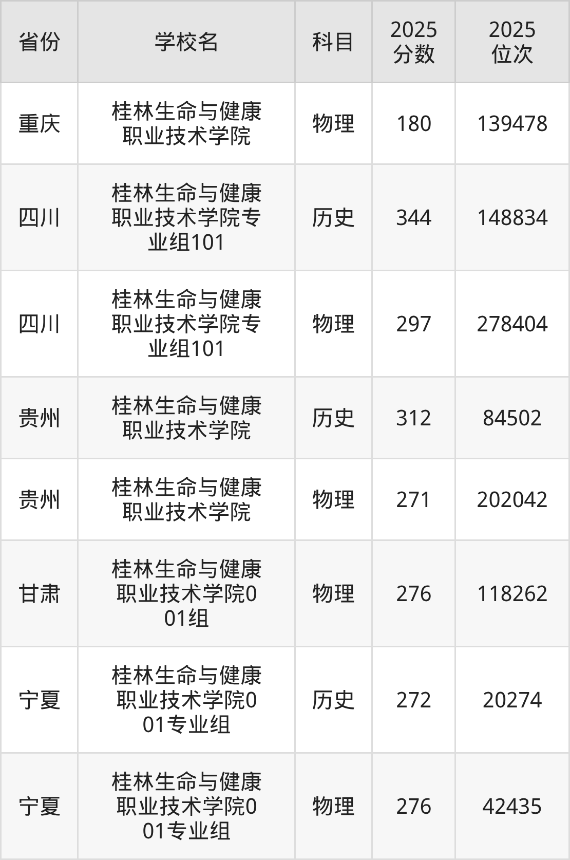 2025年桂林生命与健康职业技术学院在壮族自治区内分历史物理科目类录取,其中历史类最低分是200分、对应位次是119103名;物理类最低分是200分,对应位次是260350名。