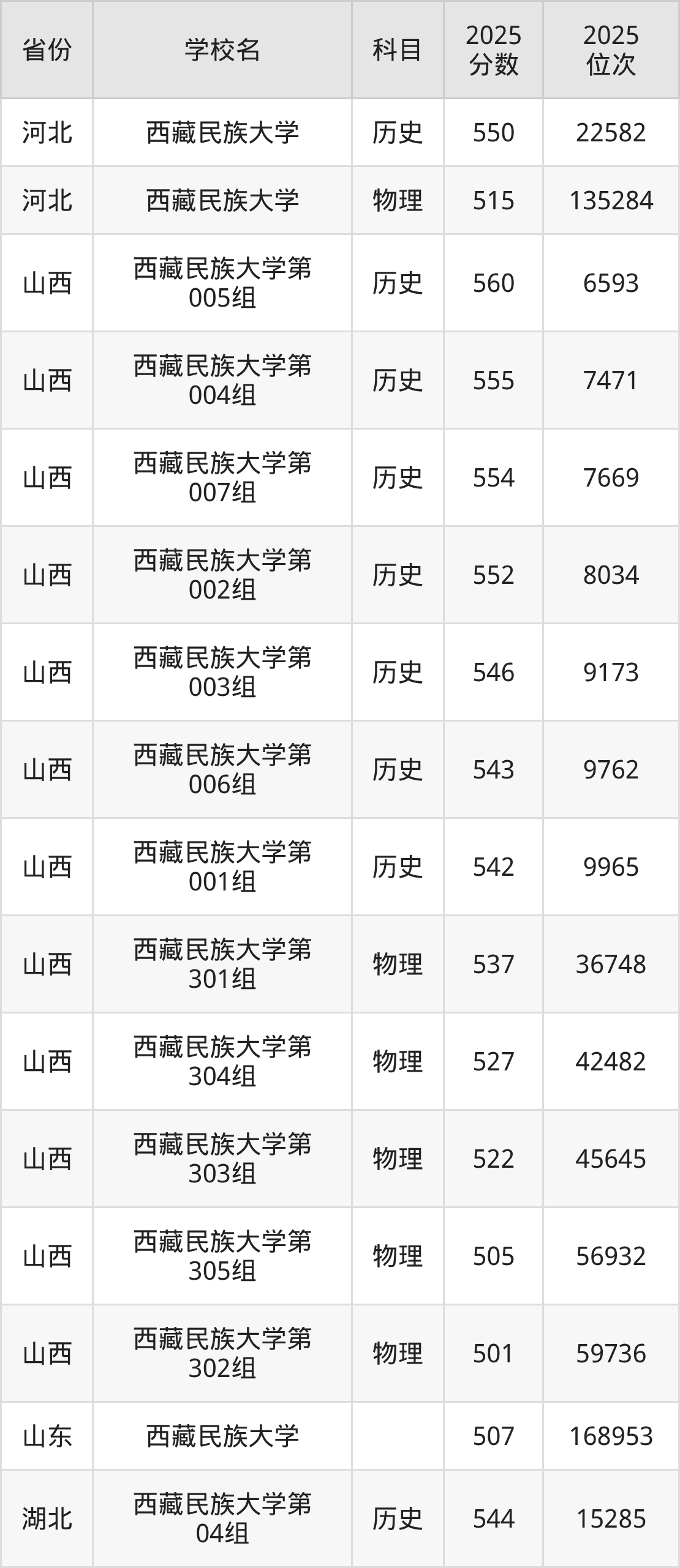2025年西藏民族大学在省外录取分数线范围整体位于449分到560分之间,录取分数线最低在广西物理(112组)、录取分数线最高在山西历史(第005组)。