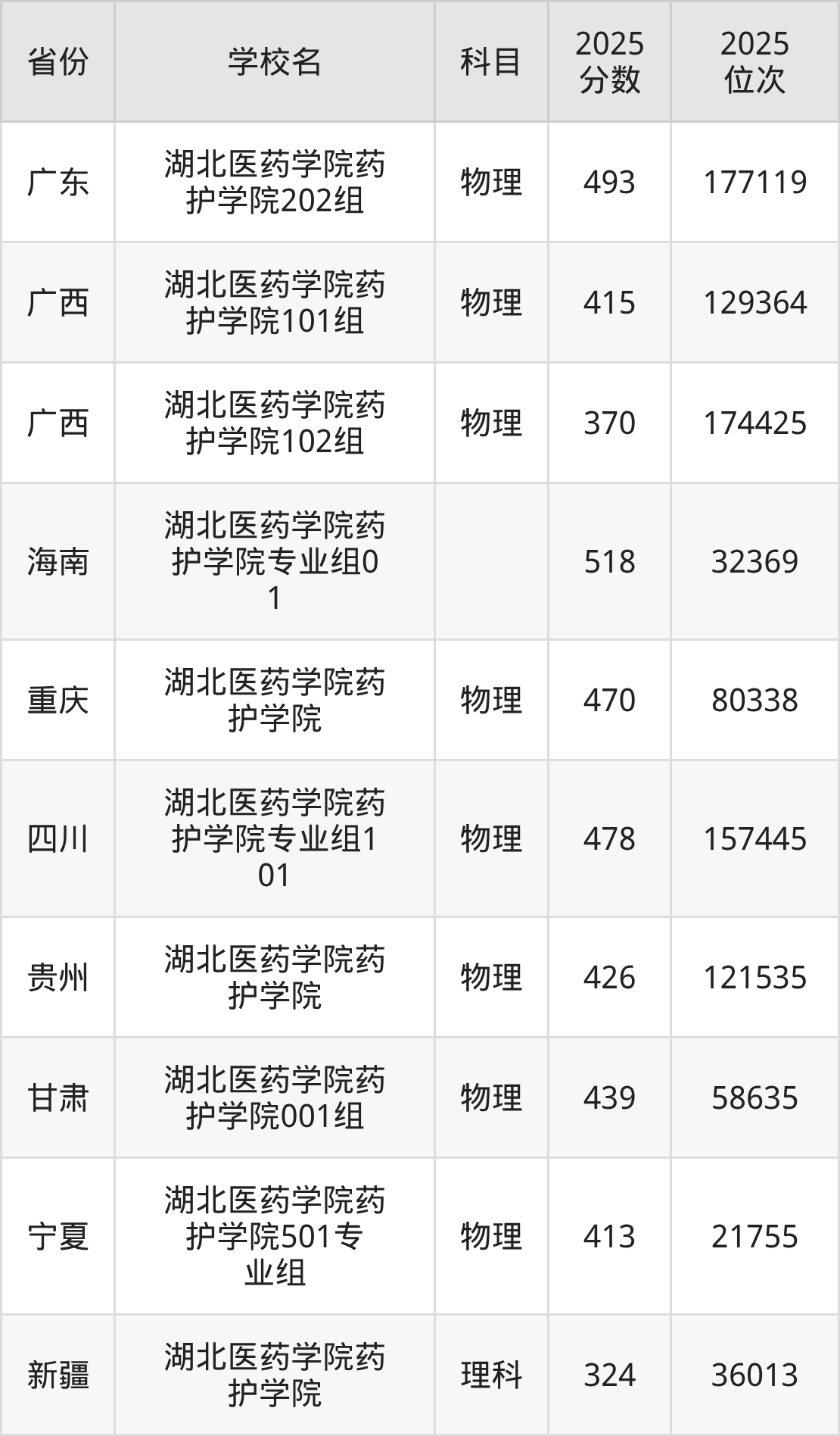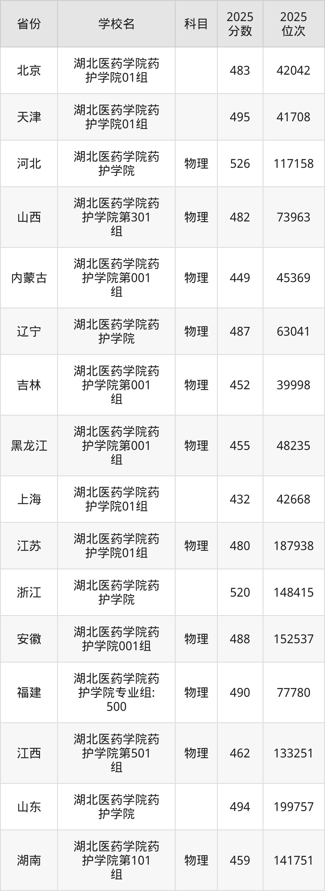 2025年湖北医药学院药护学院历史类最低分482分(35174名)、物理类最低分441分(137043名)。