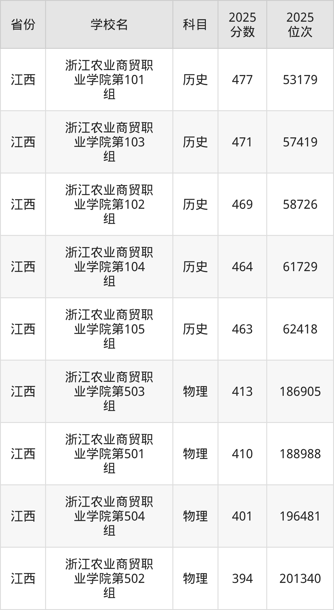 2025年浙江农业商贸职业学院在省外录取分数线范围整体位于394分到477分之间,录取分数线最低在江西物理(第502组)、录取分数线最高在江西历史(第101组)。